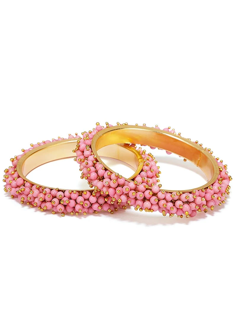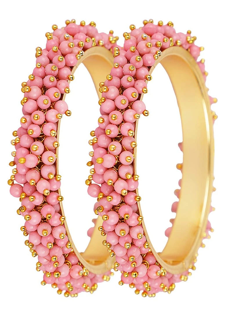 The bangles feature a stunning combination of golden and baby pink beads meticulously arranged in a delicate pattern. Each bead is carefully selected to ensure uniformity in size and shape creating a harmonious visual appeal. The golden beads exude a rich luxurious aura while the baby pink beads add a touch of femininity and grace making these bangles a perfect choice for both traditional and contemporary outfits.