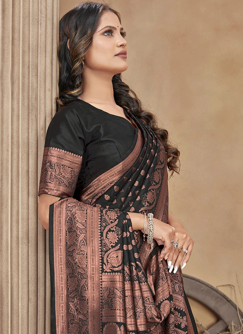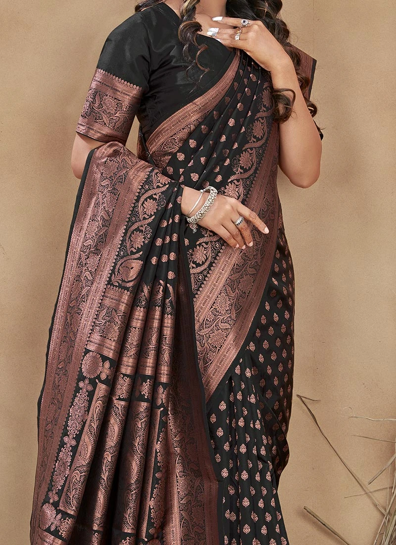 Banarasi Silk Black Color Woven Jacquard Work Saree Festive Wear