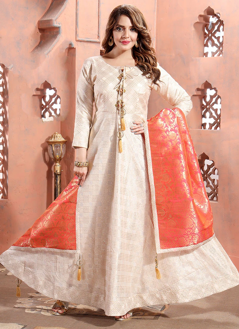Indulge in the exquisite world of fashion with our Beige Art Silk Embroidered Dresses and Gowns where tradition seamlessly blends with contemporary allure. Crafted with meticulous precision and adorned with intricate embroidery these outfits redefine opulence and grace.