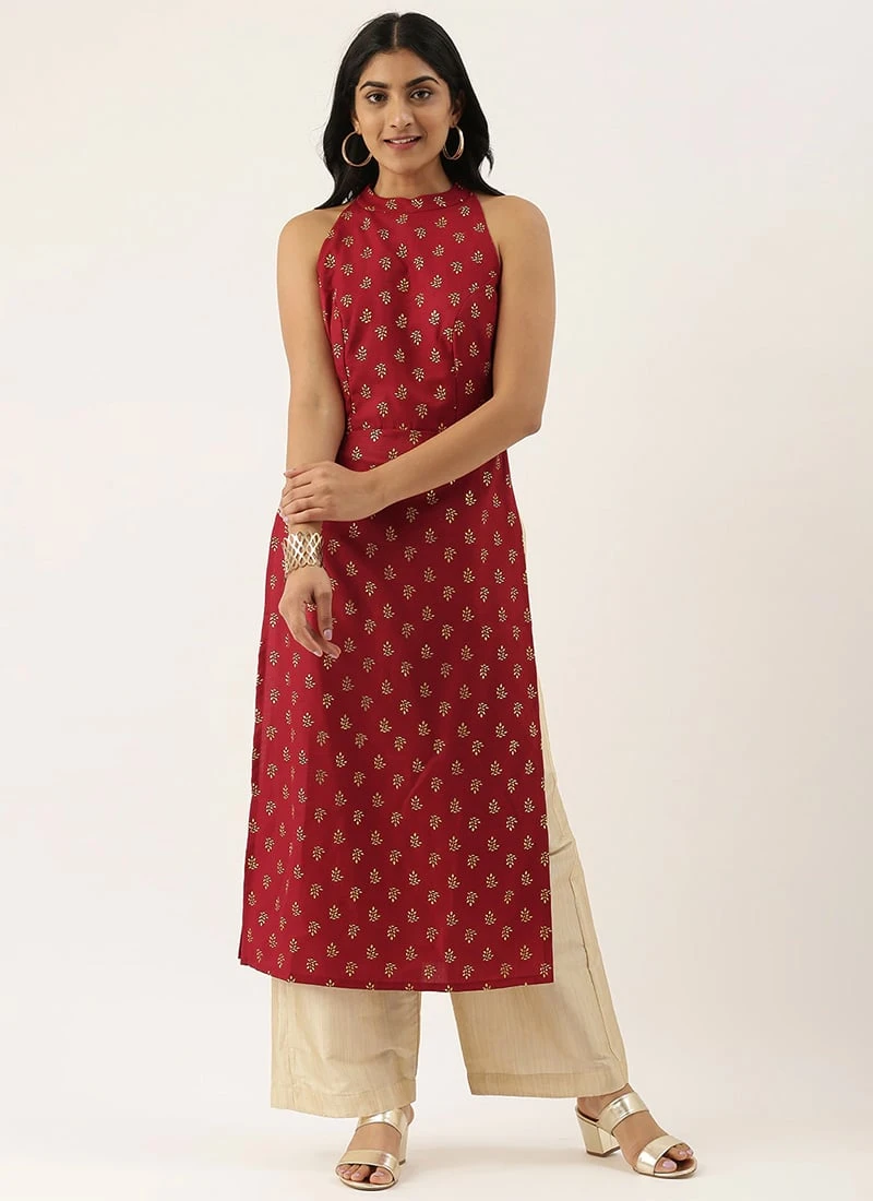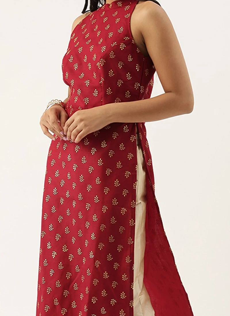 Beige N Maroon Printed Halter Neck Kurta Set Festive Wear