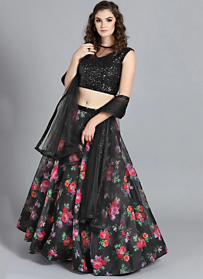 Black Digital Printed Organza Umbrella Skirt Party Wear