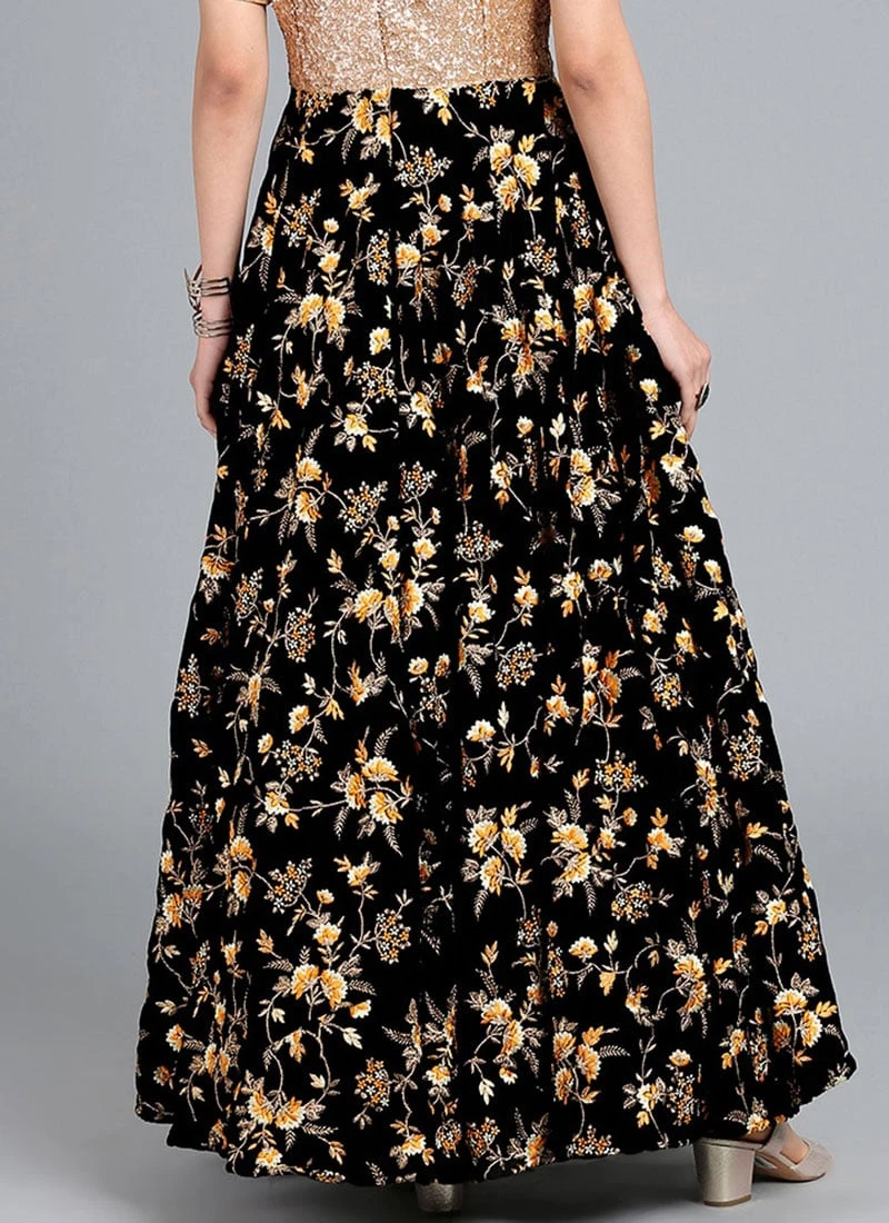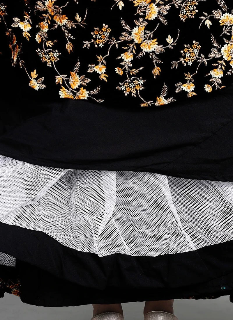 Presenting black embroidered velvet skirt, features a full circular flare till floor length, contoured waist band with zipper..