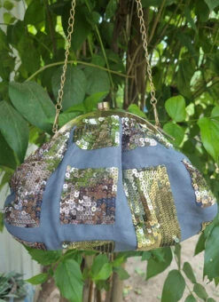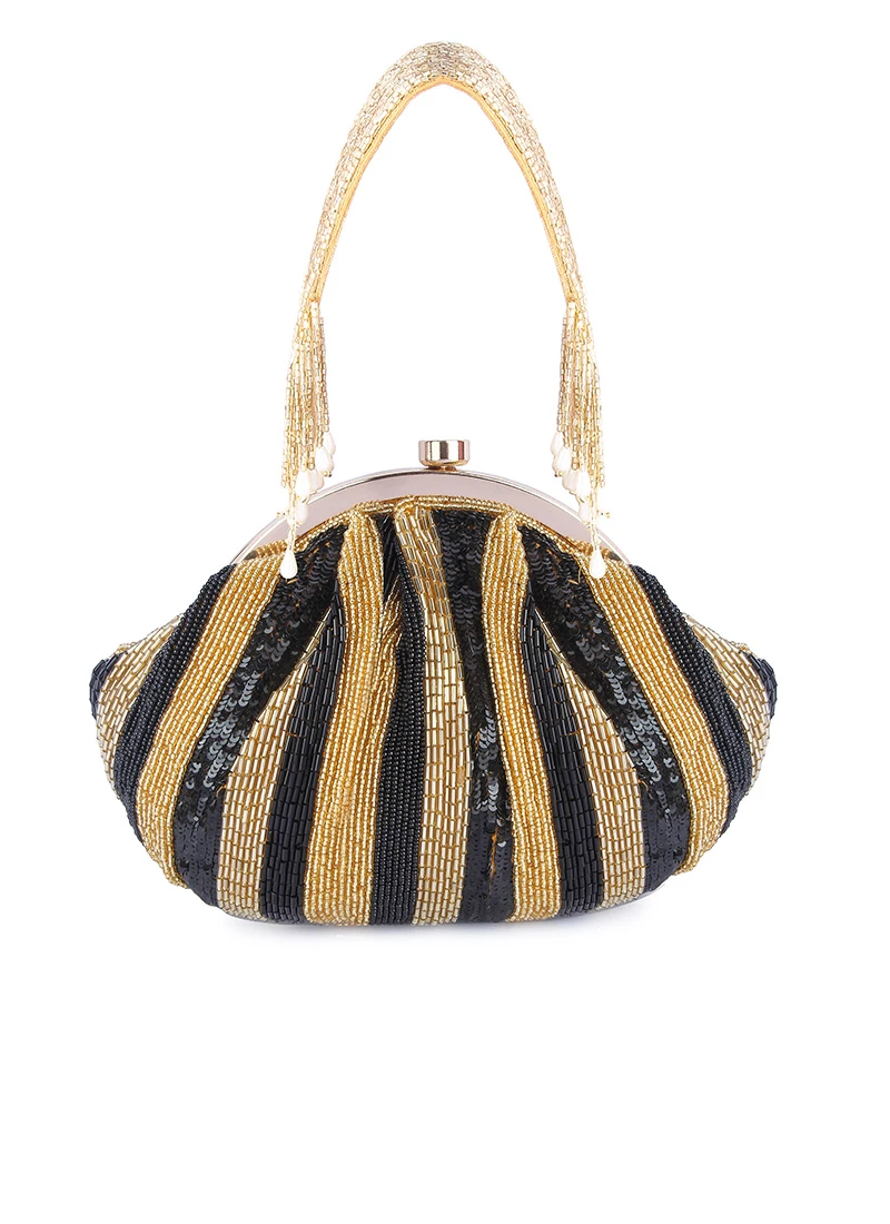 The black and golden silk designer clutch enriched hand embroidered with bugle beads and sequins work.