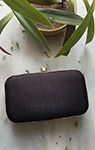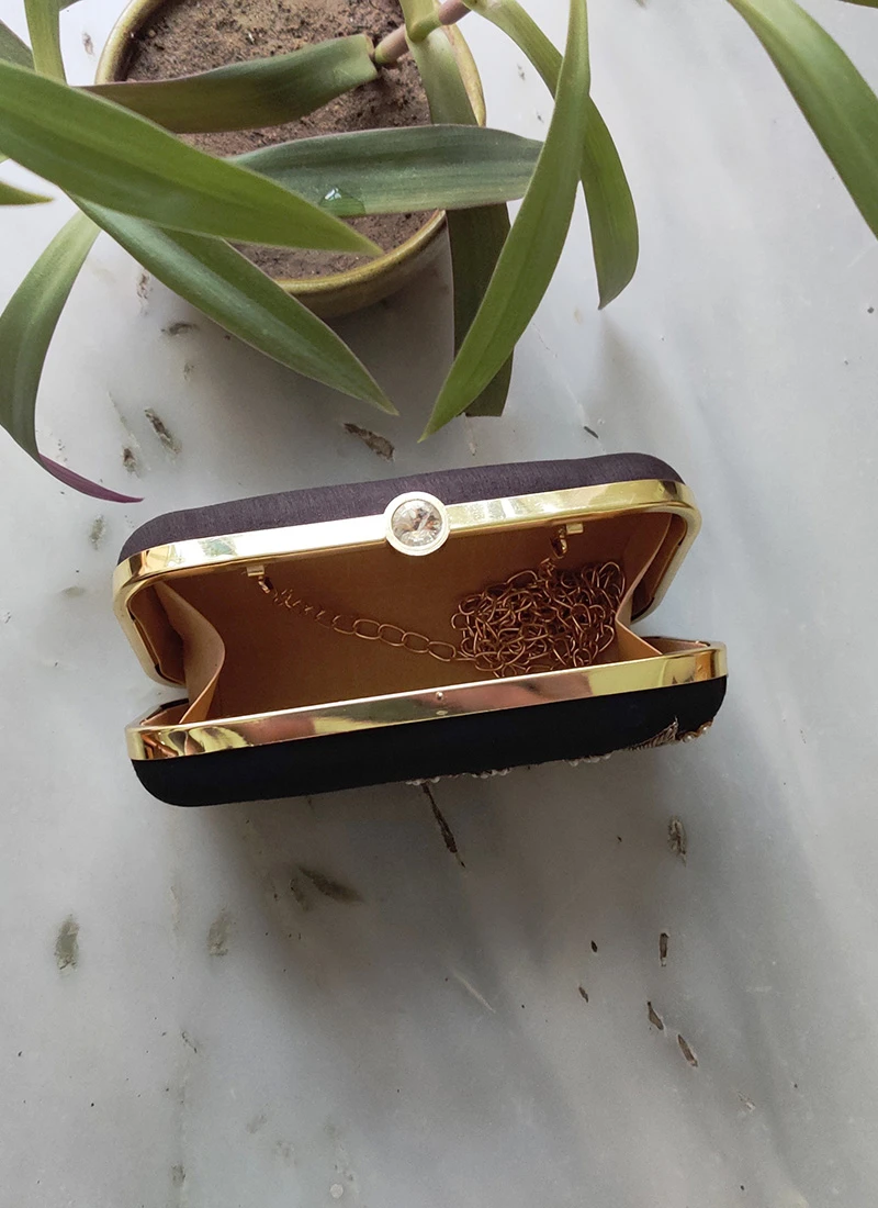 This pretty black silk designer clutch enriched hand embroidered with zardosi and pearl work on one side with long sling chain.