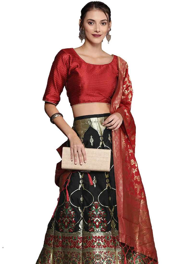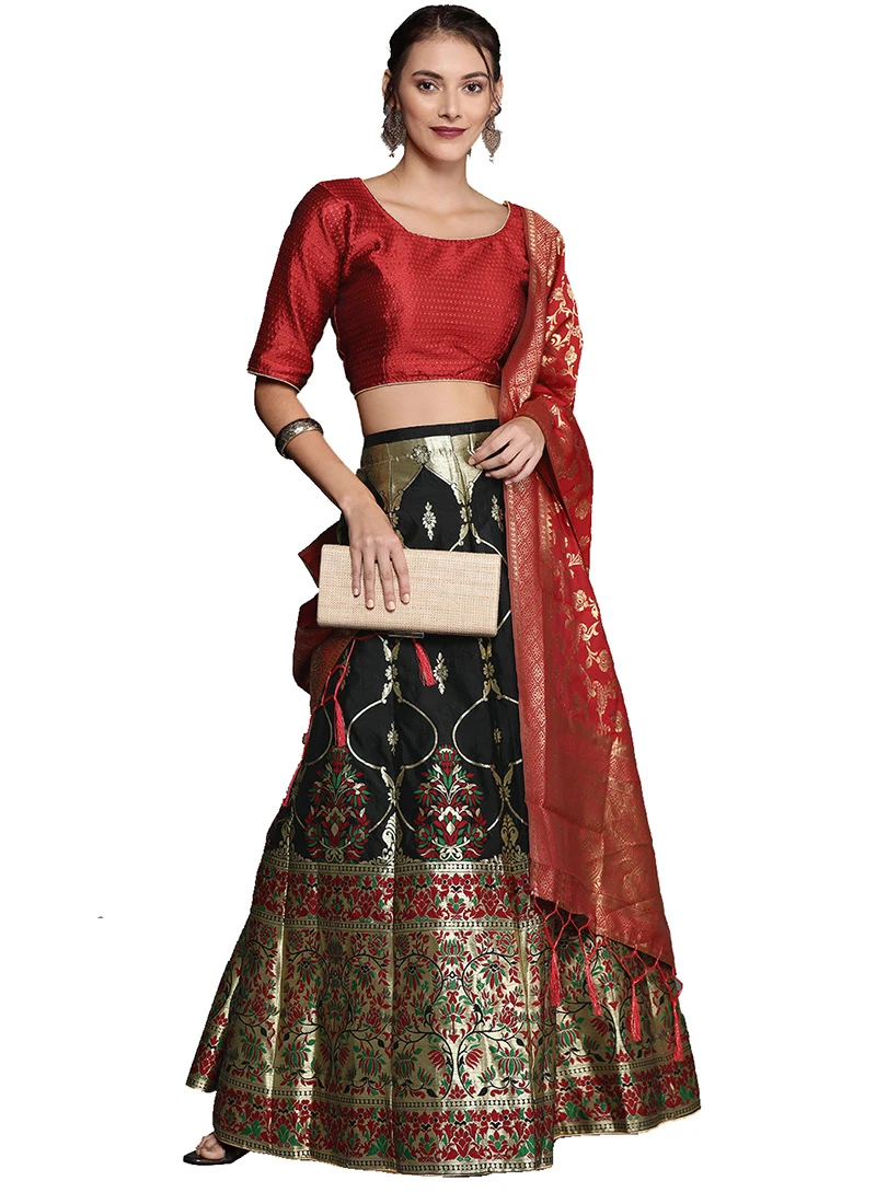 Comes with semi -stitched lehenga, un stitched choli and dupatta fabric. To have it stitched, please select the custom tailoring options. Lehenga with elaborate patterns and colors are used for photo-shoot. Color and pattern of the lehenga might not be as shown in the image.