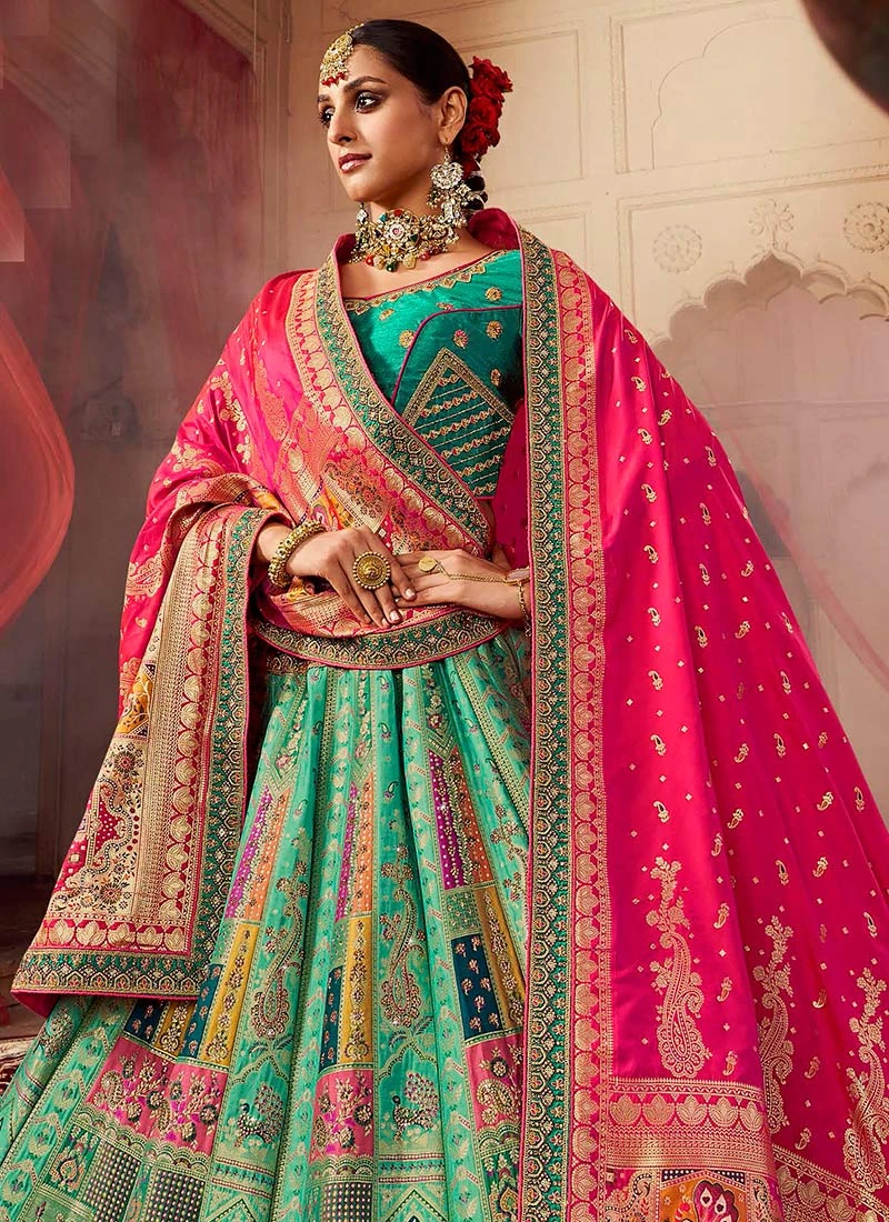 Comes with semi -stitched lehenga, un stitched choli and dupatta fabric. To have it stitched, please select the custom tailoring options. Lehenga with elaborate patterns and colors are used for photo-shoot. Color and pattern of the lehenga might not be as shown in the image.