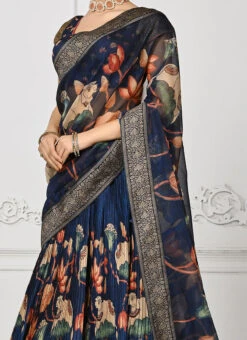 The lehengas vibrant blue colour serves as a canvas for the intricate Kalamkari motifs which typically include depictions of mythological themes floral patterns and intricate detailing. The artistry of the print adds a touch of cultural richness to the ensemble making it perfect for special occasions weddings and festive celebrations.