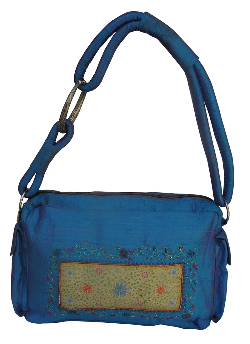 The designer blue clutch with some decorative designs on it.