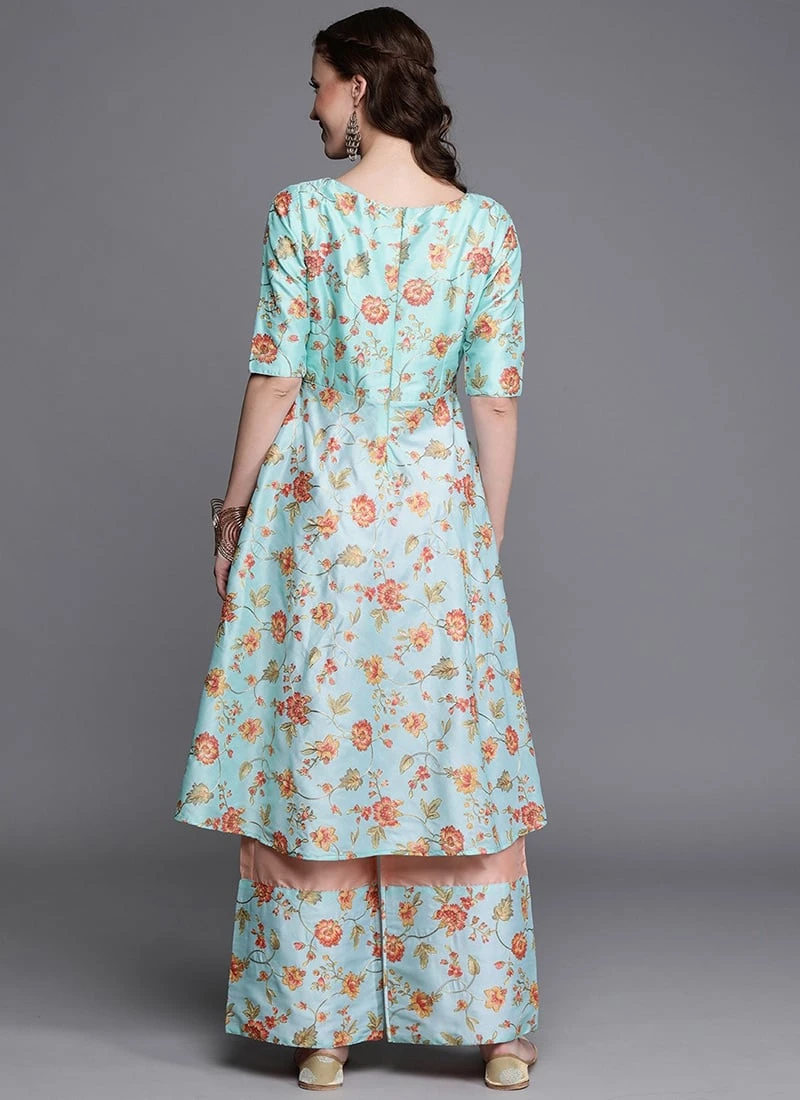 Blue Embroidered N Peach Kurta N Wide Leg Pant Festive Wear