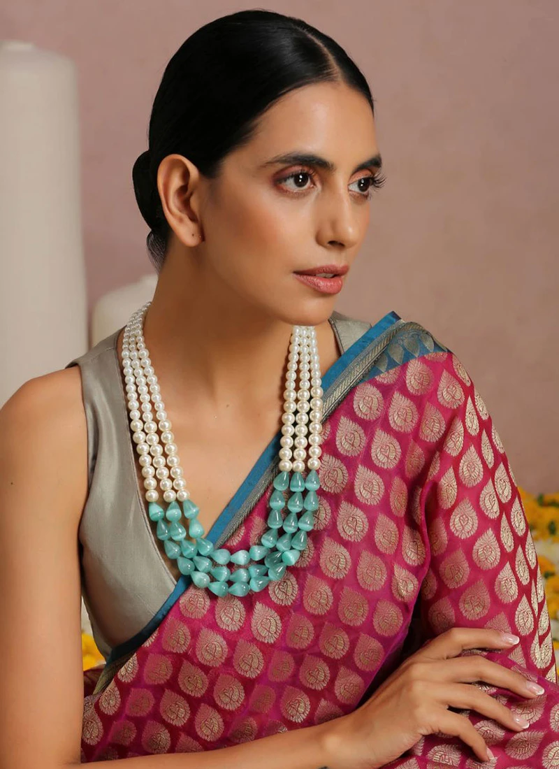 The golden plated three layered necklace set comes with white n blue color beads work looks more attractive.