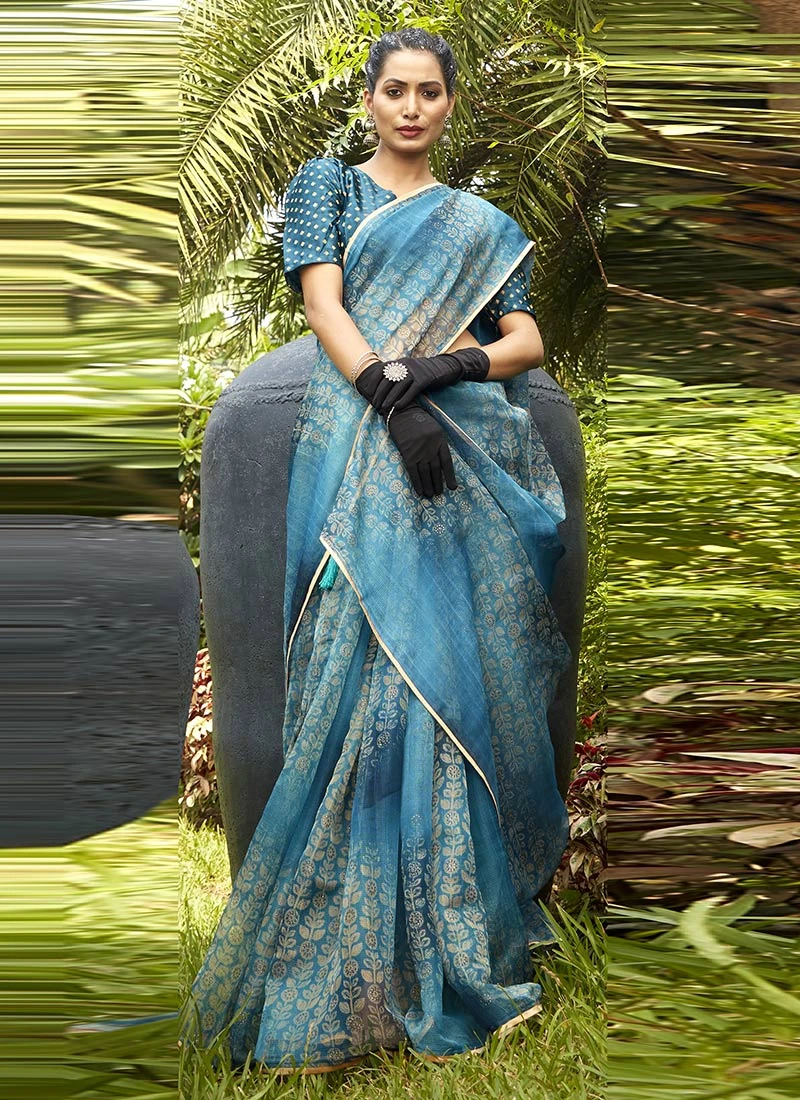 Comes with unstitched blouse fabric. To have the blouse stitched, please select the custom tailoring options. Blouses with elaborate patterns and colors are used for photo-shoot. Color and pattern of the blouse might not be as shown in the image.