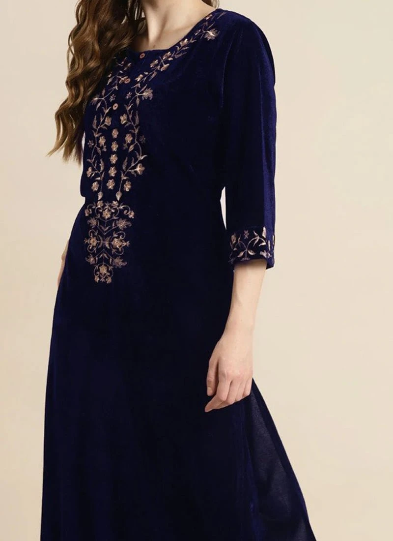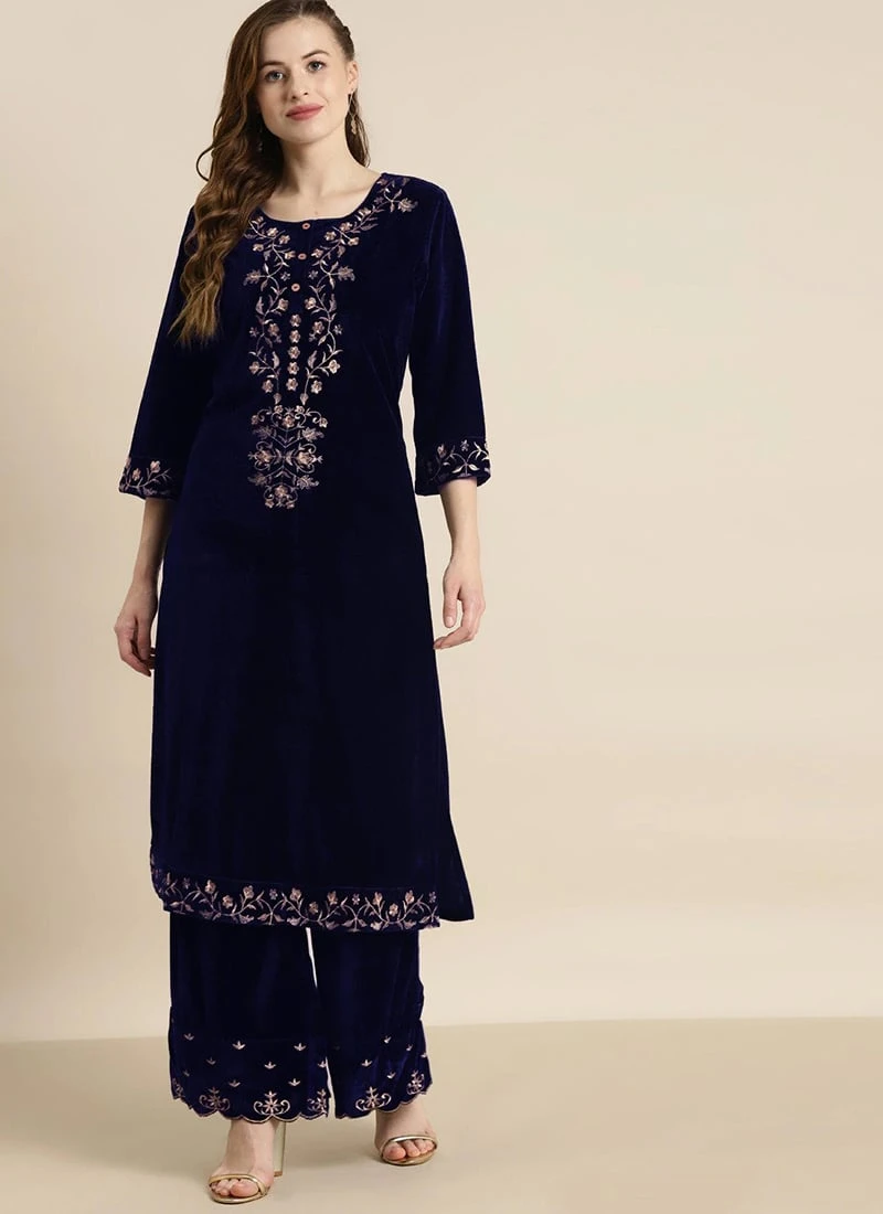 Presenting this blue color velvet kurta designed with embroidery work all over the attire with medium round neckline and three fourth sleeve the top length till calf level looks great. Comes with navy blue color velvet embroidery palazzo pant bottom.