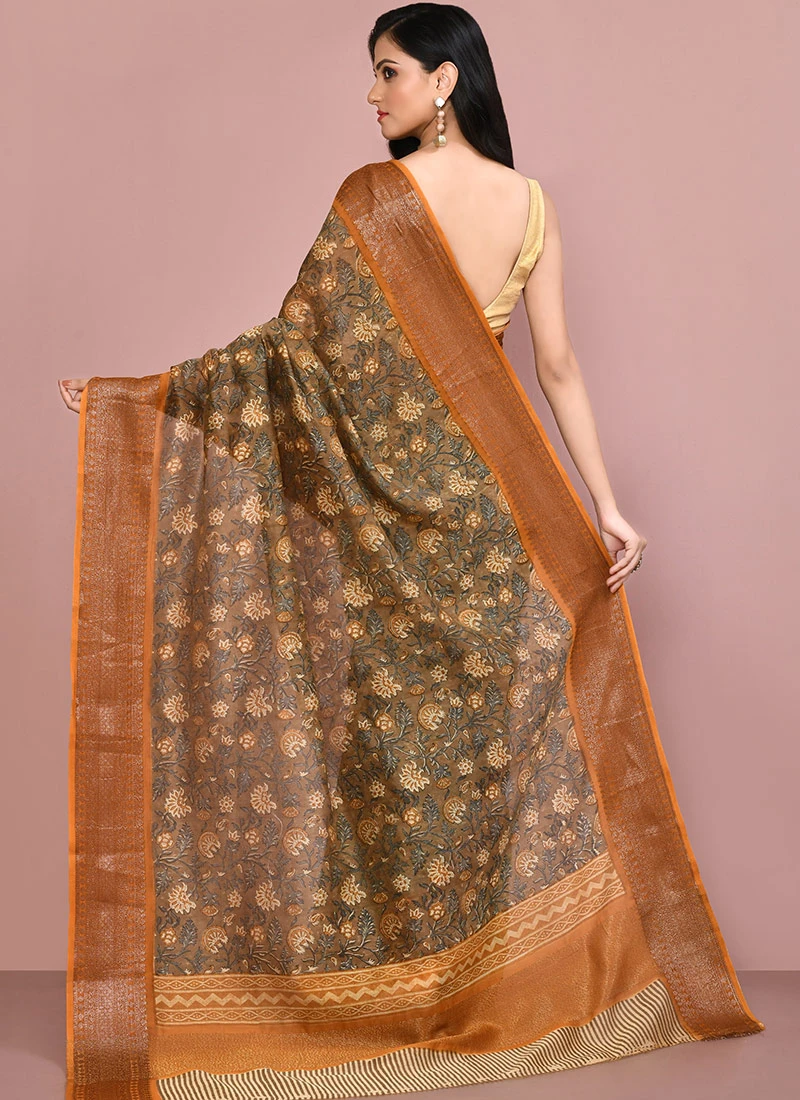 Comes with unstitched blouse fabric. To have the blouse stitched, please select the custom tailoring options. Blouses with elaborate patterns and colors are used for photo-shoot. Color and pattern of the blouse might not be as shown in the image.