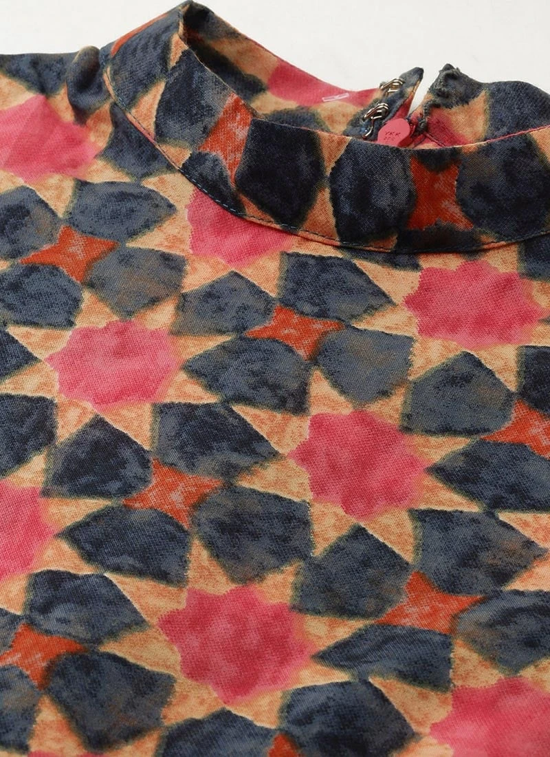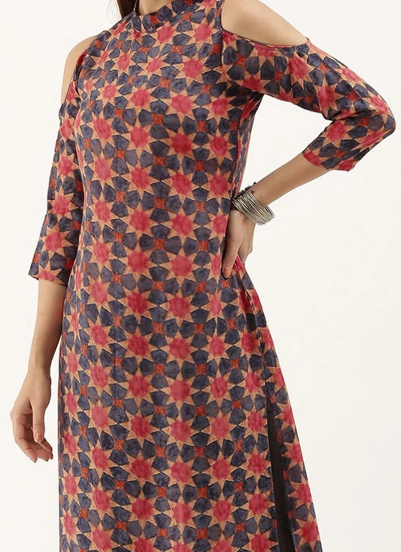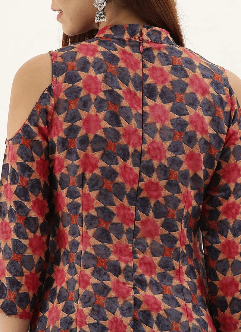 Presenting a multicolor printed cotton straight pant kurta set, features a collar neckline in front and back, cold shoulder three-fourth sleeve, calf-length and comes with back zip closure, till calf length. The black taffeta bottom comes with band with elastic waist band till ankle length..