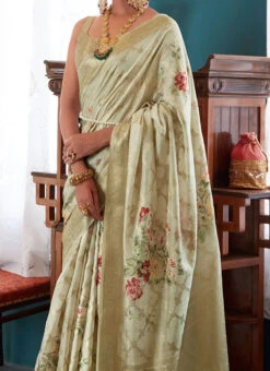 This sari features a classic and versatile design that is perfect for various occasions. It comes with a matching blouse piece that allows you to customize your look according to your preferences. The pallu the decorative end of the sari is adorned with intricate prints and embellishments that add a touch of opulence to the overall design. The border of the sari is elegantly decorated framing the drape beautifully.
