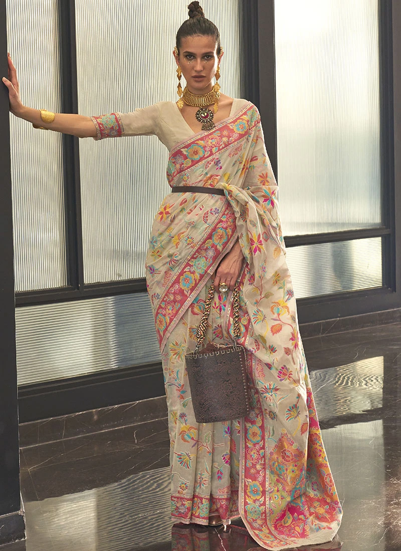 Cream Color Jacquard Woven Kashmiri Modal Silk Saree Festive Wear