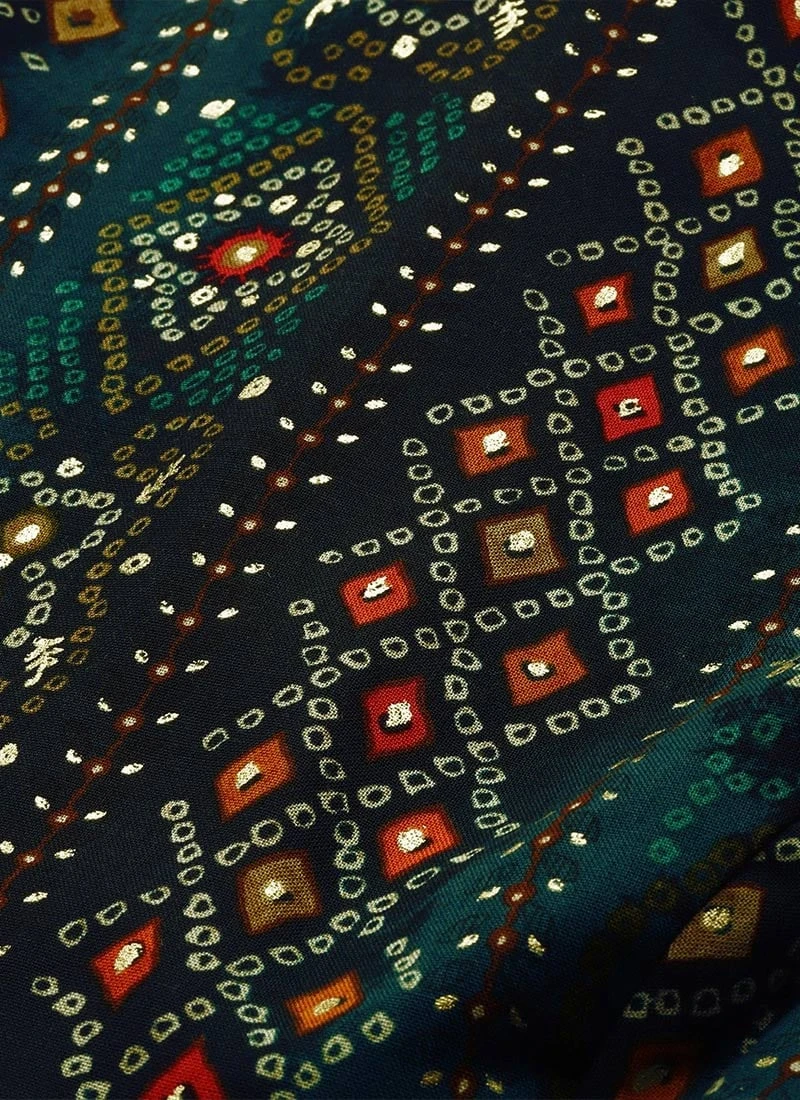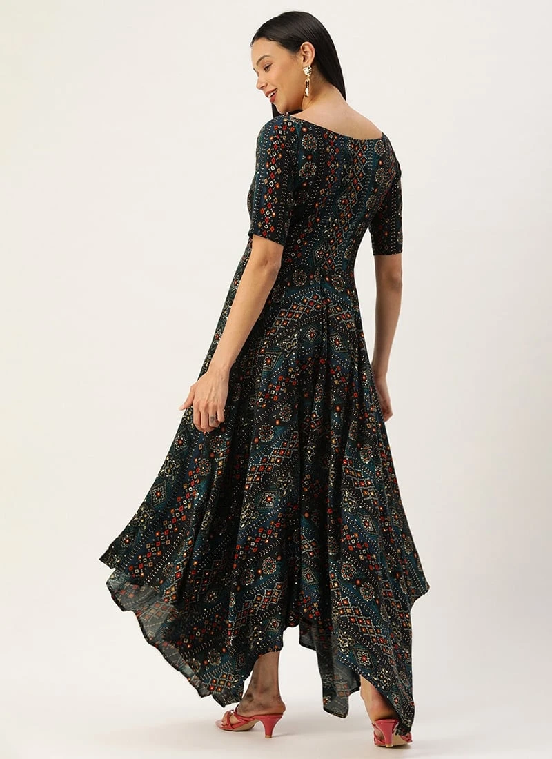Dark Blue Printed Handkerchief Style Dress Festive Wear