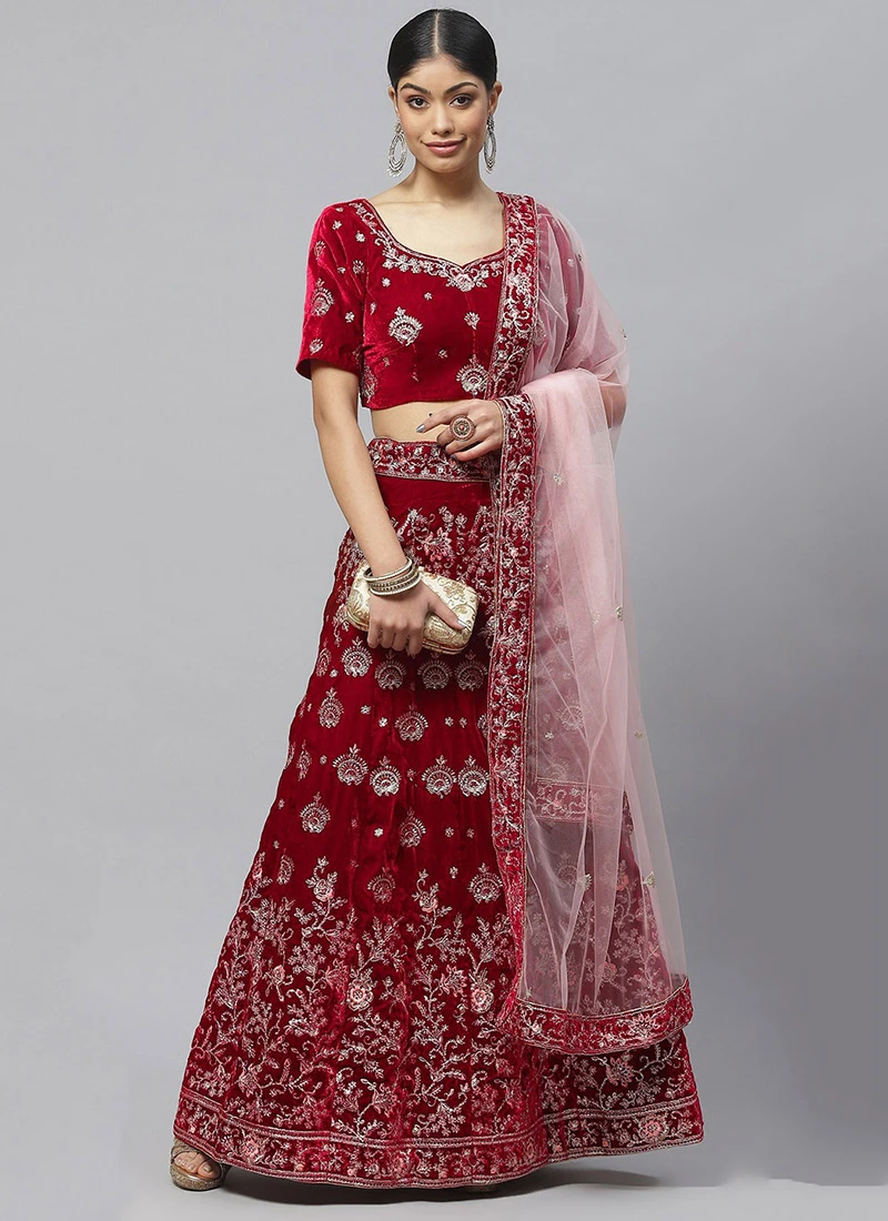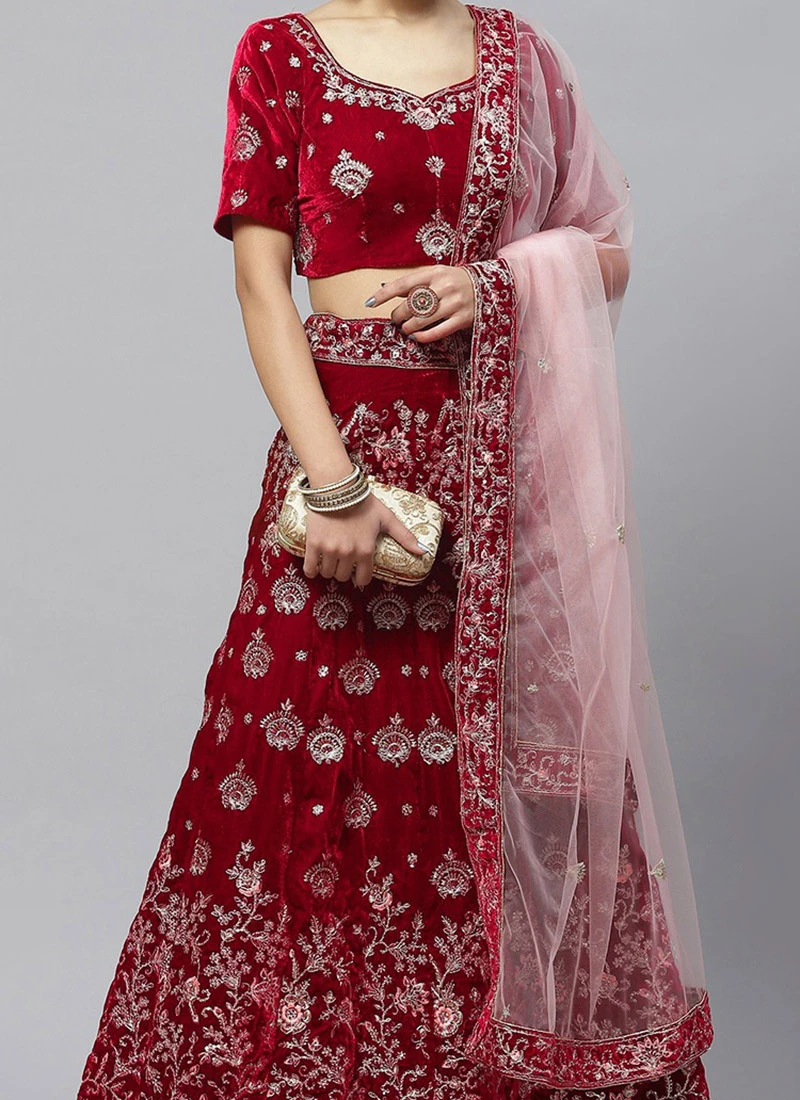 Dark Red Velvet Embroidered A Line Lehenga Party Wear