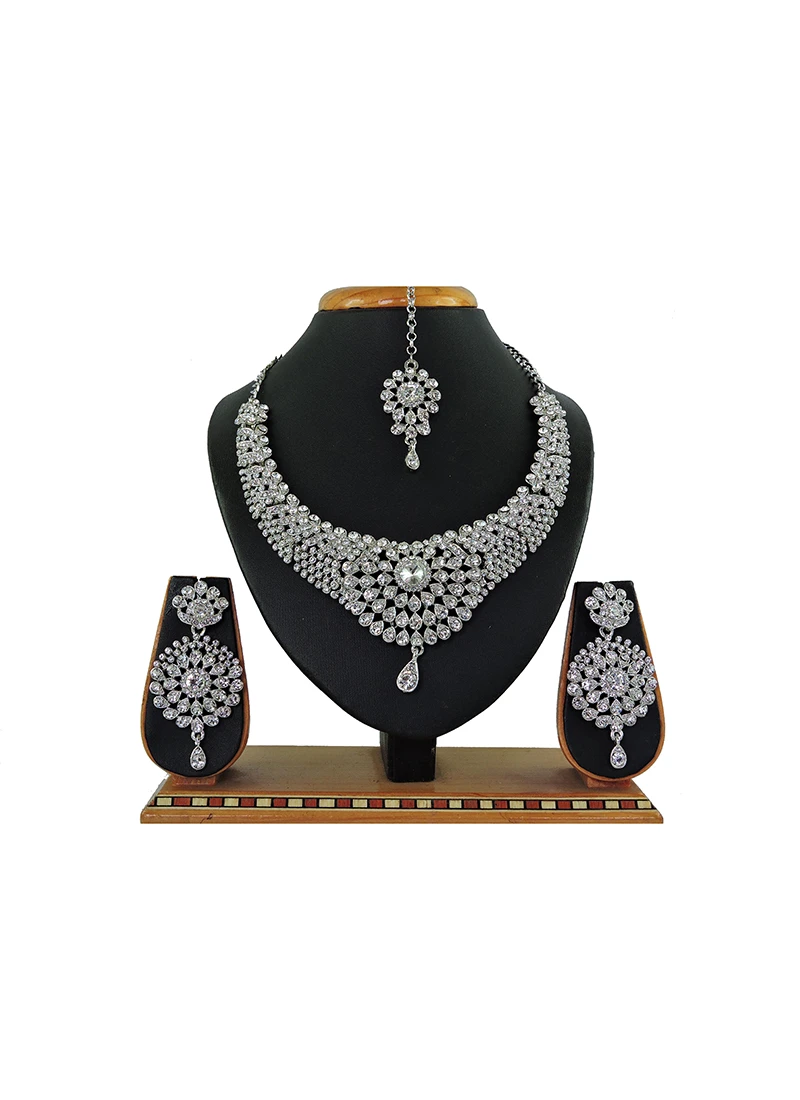 Designe white stones silver polish delicate bridal necklace set made up of alloy and back with silver color chain hook for women will complement any wedding attire. This set comes with matching white stones danglers earrings and mangtikka.