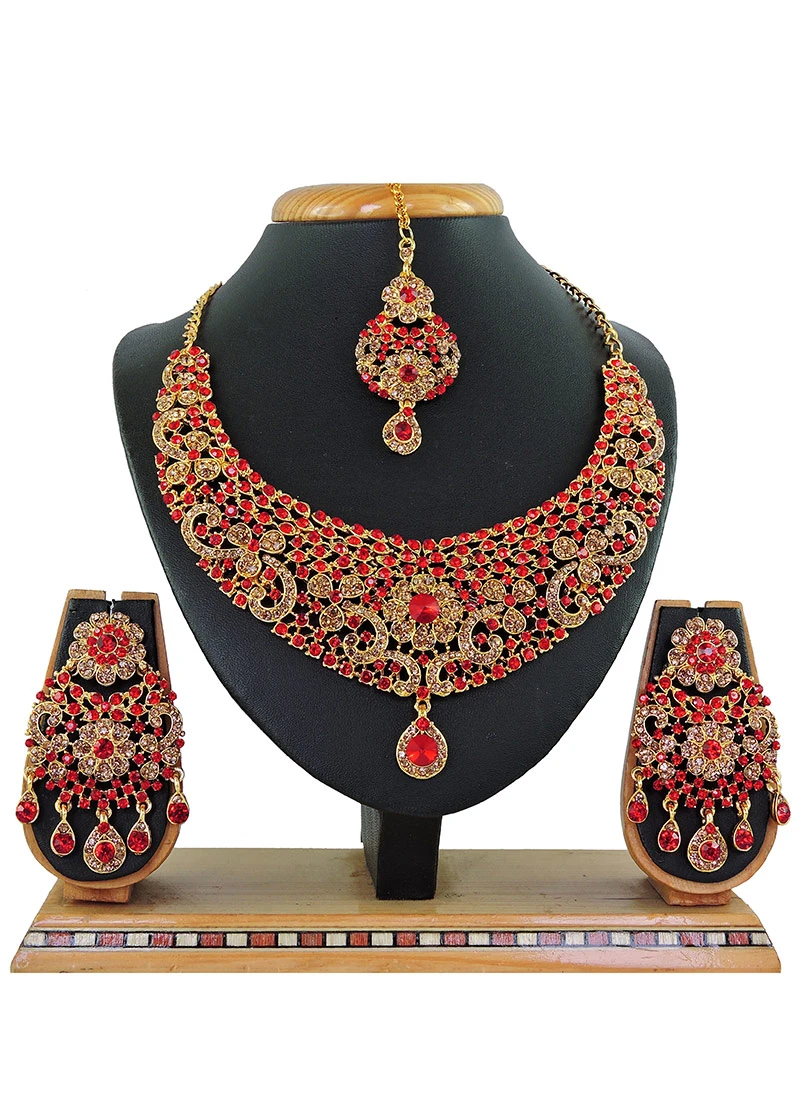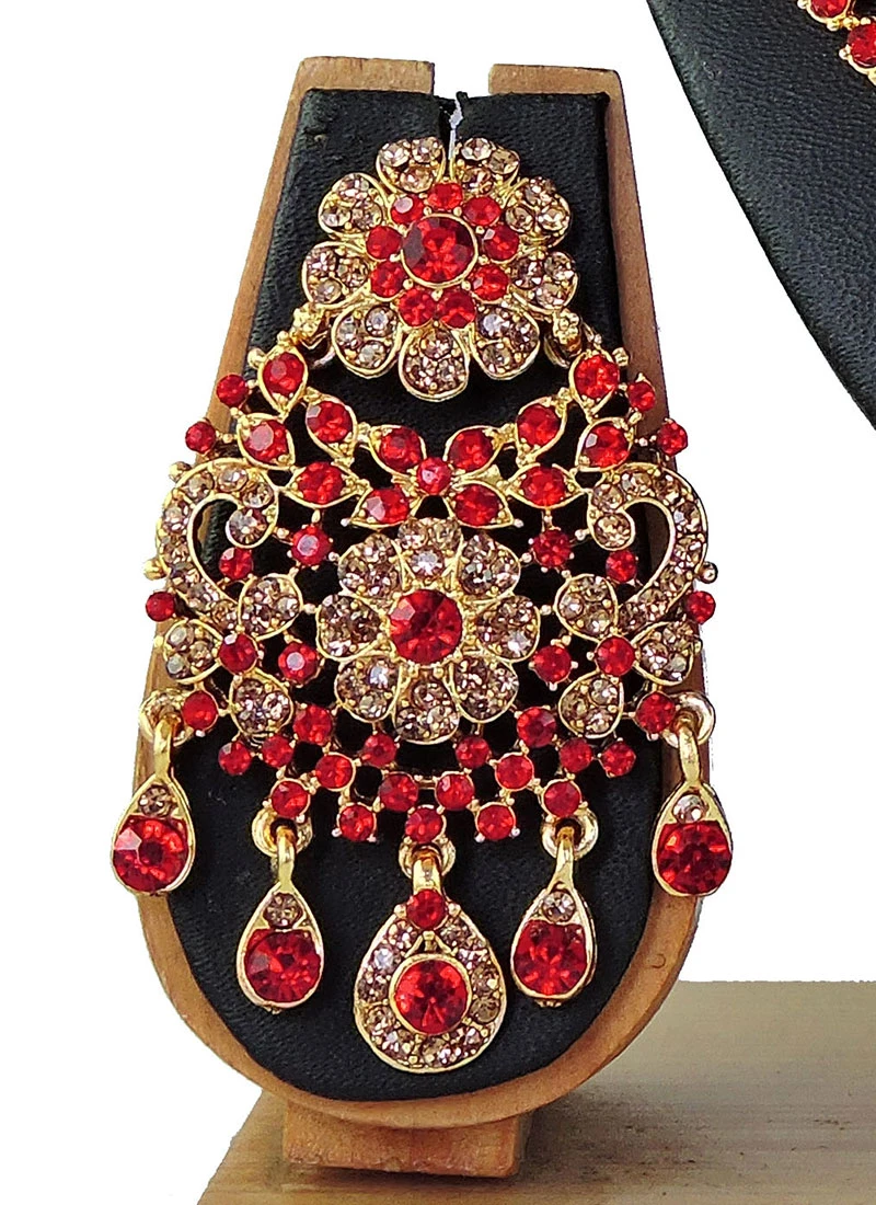 Designer gold n ruby red stones gold polish princess necklace set made up of alloy and back with gold color chain hook for women will complement any wedding attire. This set comes with matching gold n ruby red stones chandbali earrings and mangtikka.