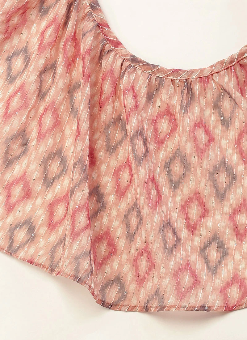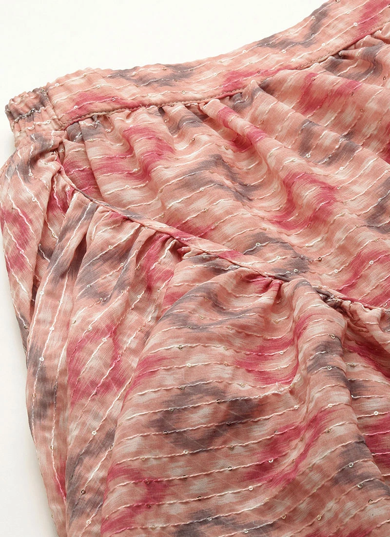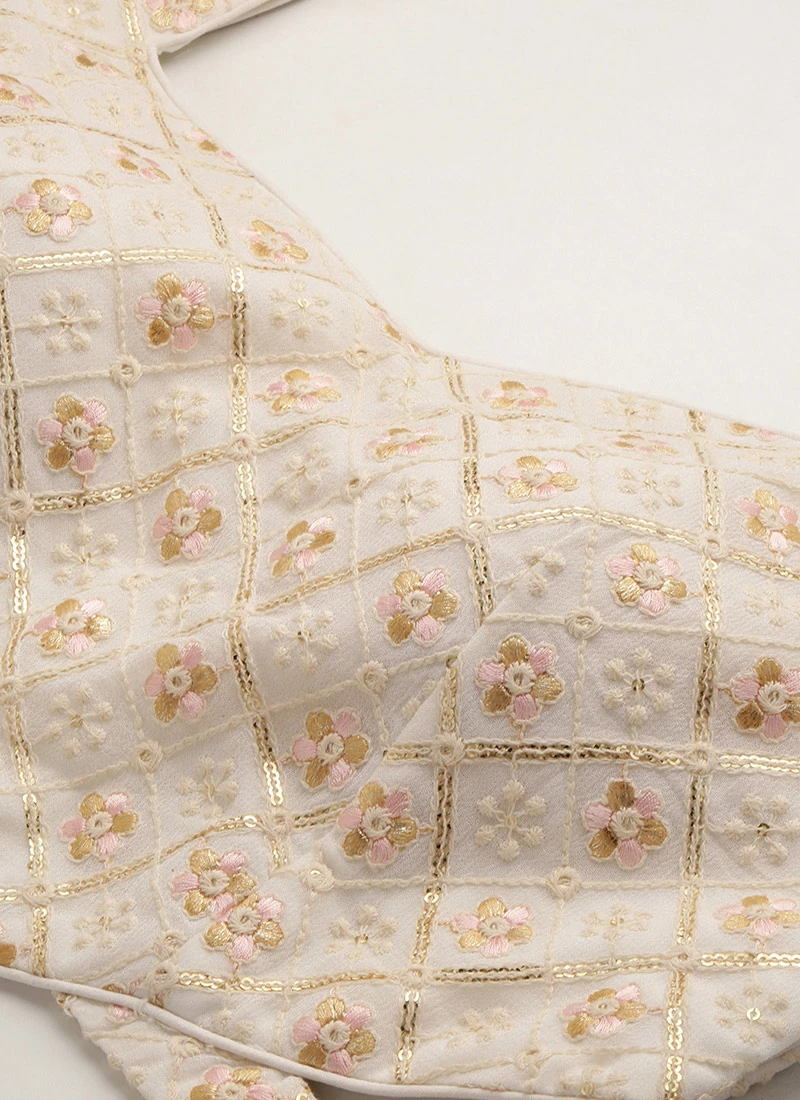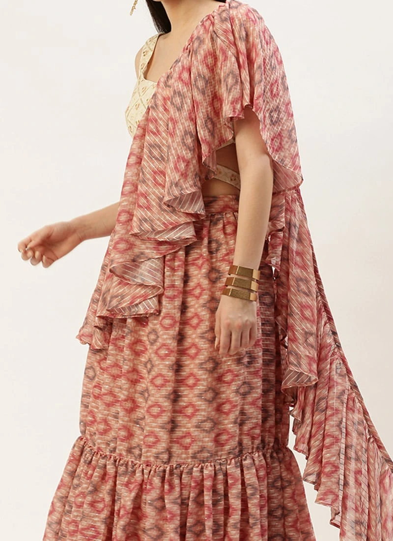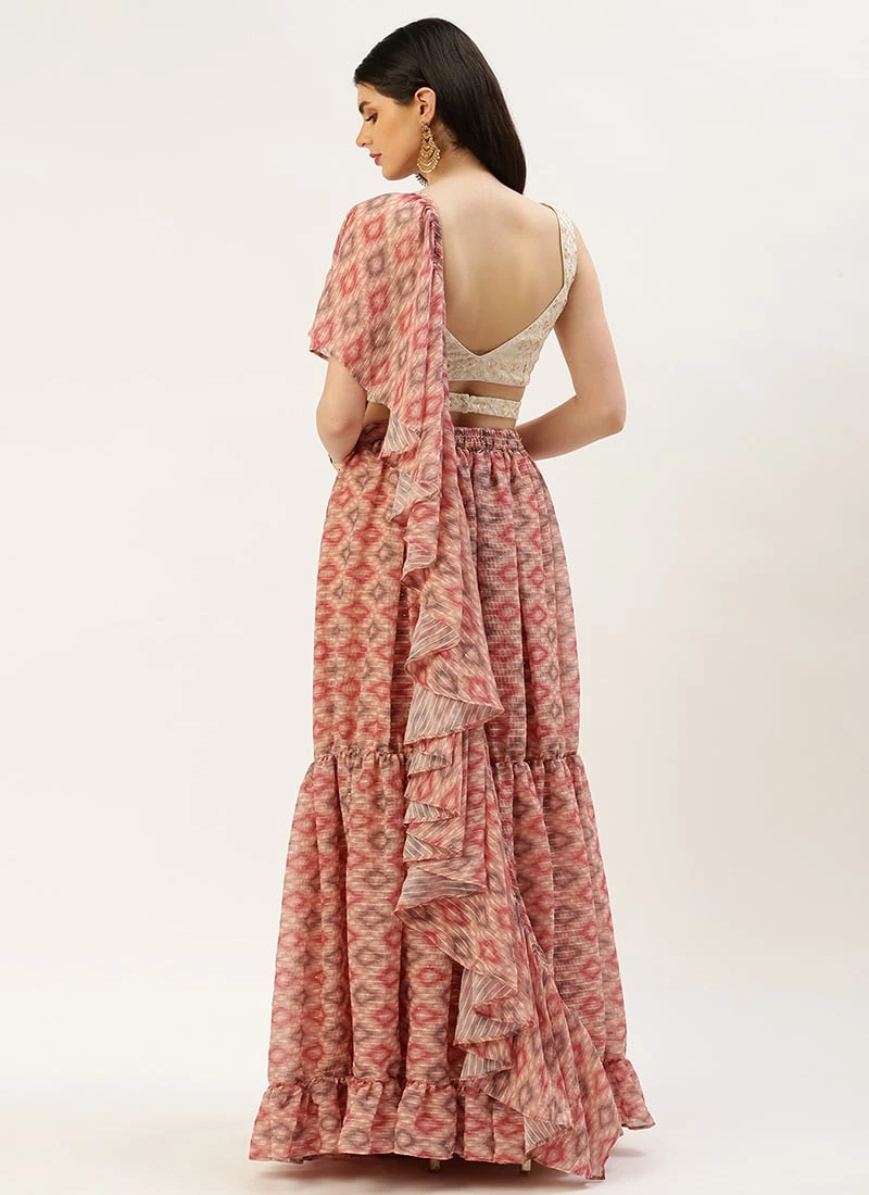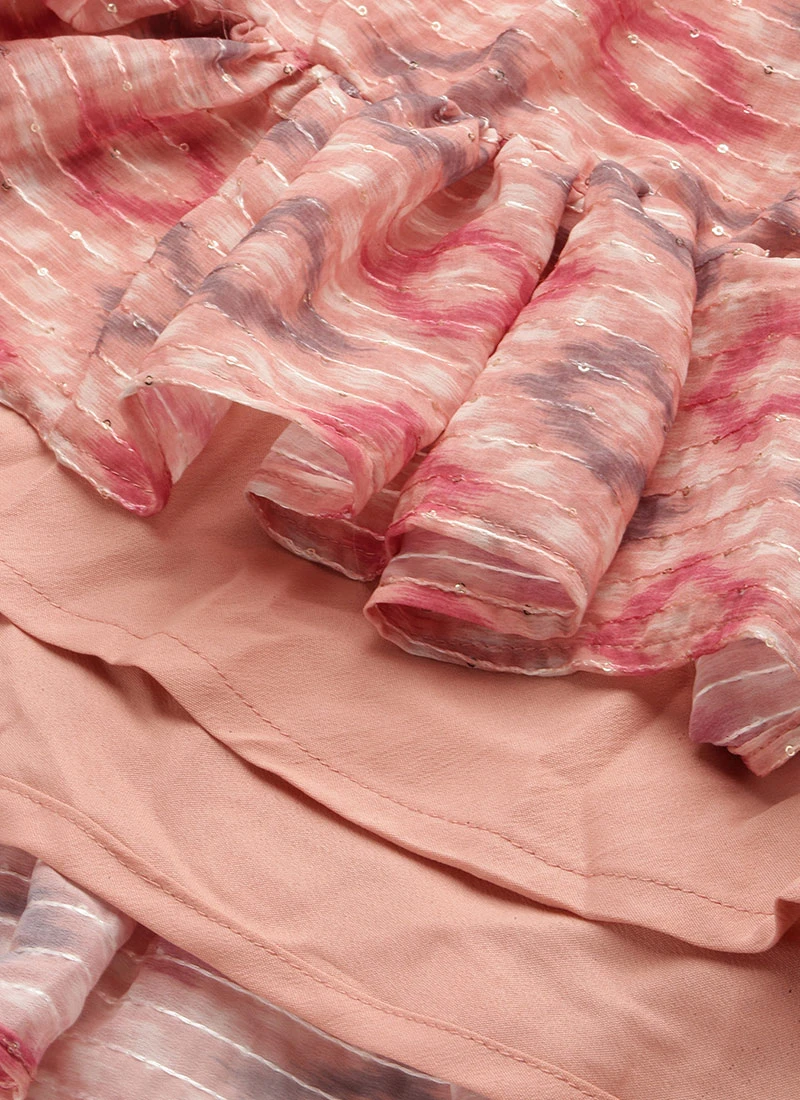 Presenting multicolored georgette digital printed lehenga set, features a off white sequence embroidered viscose natural waist blouse, front low curved pentagon neck and back very low v neck, sleeveless, blouse front inverted v shape hem with criss cross belt attached and at back hook opening for belt with side zip. It’s paired with multicolored georgette digital printed three layer of tiered gathers lehenga, waist band type band with elastic with gathers in the waist band. Comes with multicolored georgette half circular dupatta with ruffles.