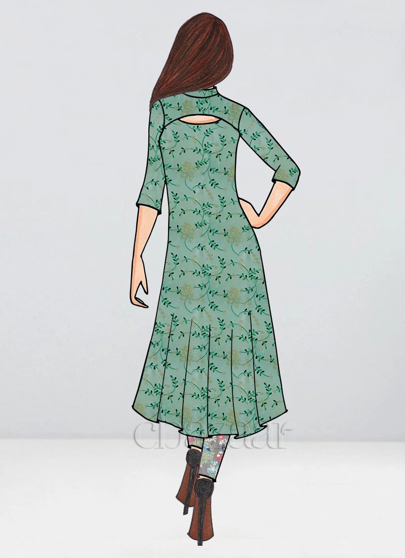 Presenting a sea green embroidered straight pant suit, features collar neckline, three fourth sleeves, comes with front hook opening. It is paired up with a grey chanderi narrow straight pant bottom with contoured waistband and zipper opening..