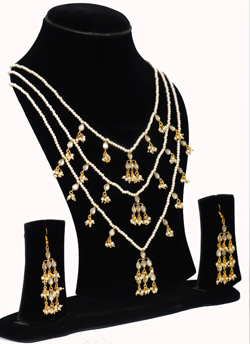 In summary the Alankar Kundan Layered Necklace Set is a masterpiece that captures the essence of Indian craftsmanship and sophistication. Its intricate design combined with the brilliance of Kundan stones and pearls creates a captivating aura of beauty and grace. This exquisite jewellery set is a testament to the rich cultural heritage of India and a symbol of timeless elegance.