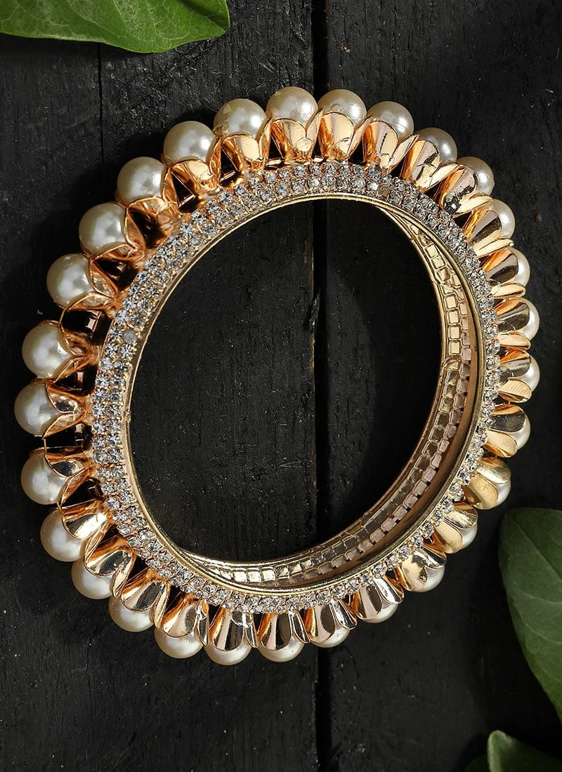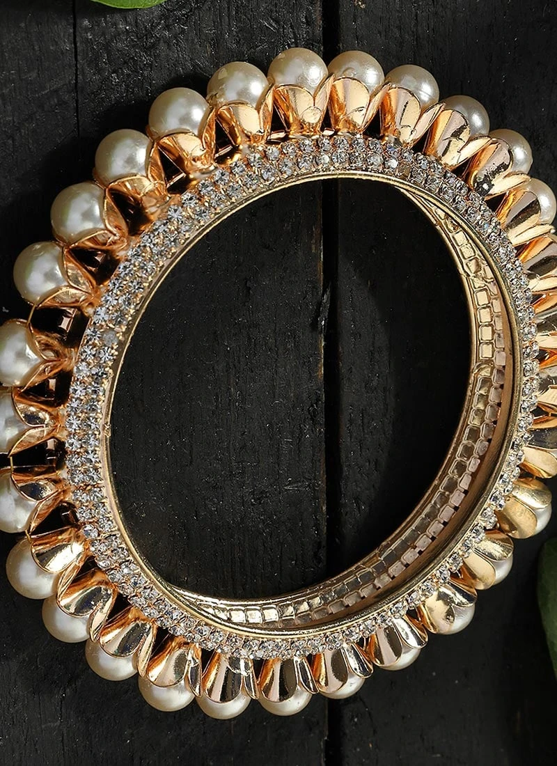 These bangles are not just accessories they are a statement of style and sophistication. They reflect your exquisite taste and appreciation for fine craftsmanship. Whether you are buying them for yourself or as a gift for a loved one these GoldenOff White American Diamond Pearl Bangles are sure to be cherished and admired for years to come. Embrace the allure of these bangles and let them add a touch of timeless elegance to your jewellery collection.