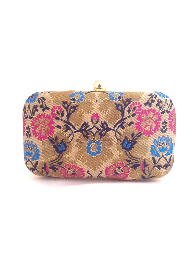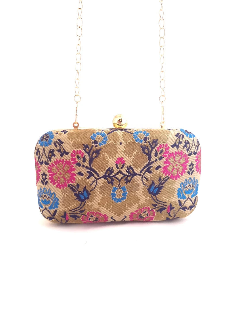 Look pretty in this golden silk designer clutch with embroidered work on both sides and comes with long sling chain.