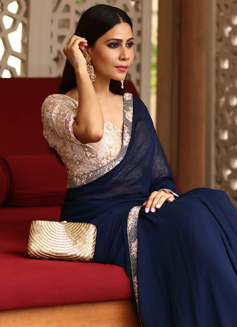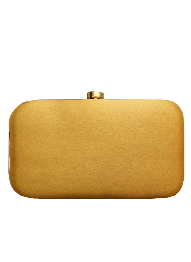 This golden color silk fabric clutch decorative with hand embroidered with bugle beads work on one side and comes with long sling chain.