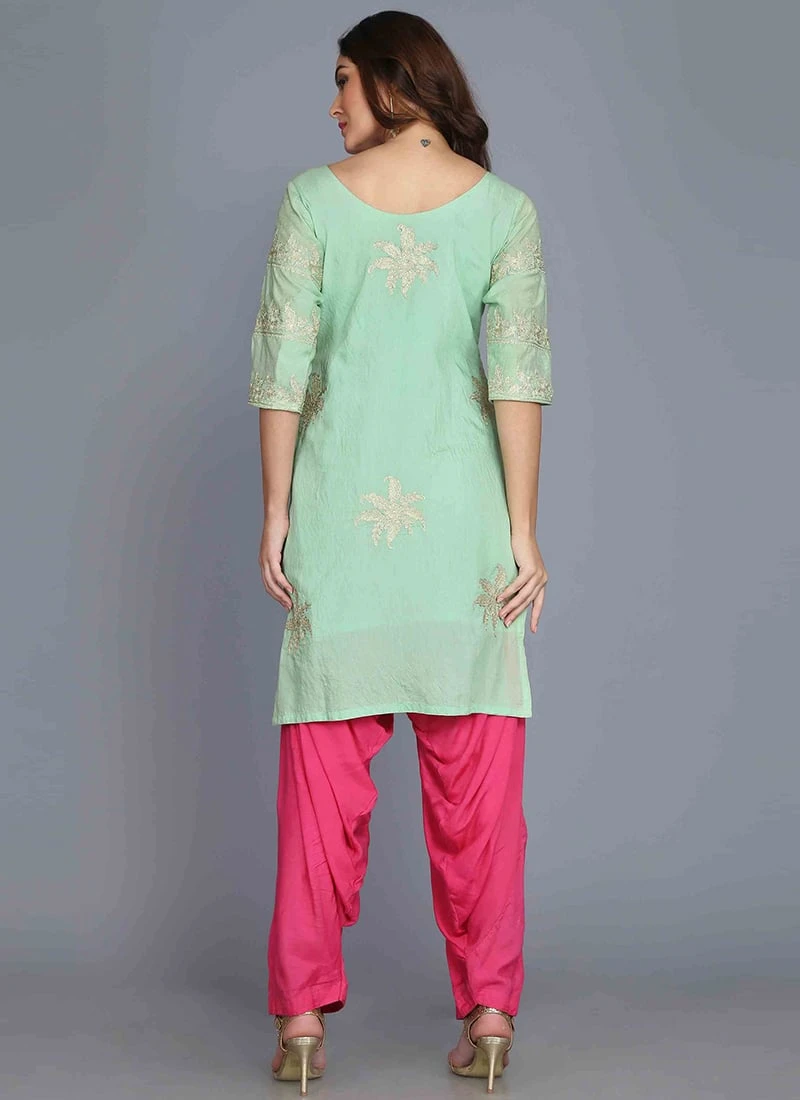 Make the heads flip whenever you costume up with this green chanderi cotton kurta salwar set. This lovely kameez comes with aari embroidery with gold zari work on the dress and crafted with round neck and three fourth sleeves. This set comes with pink shantoon salwar pant bottom.hantoon salwar pant bottom.