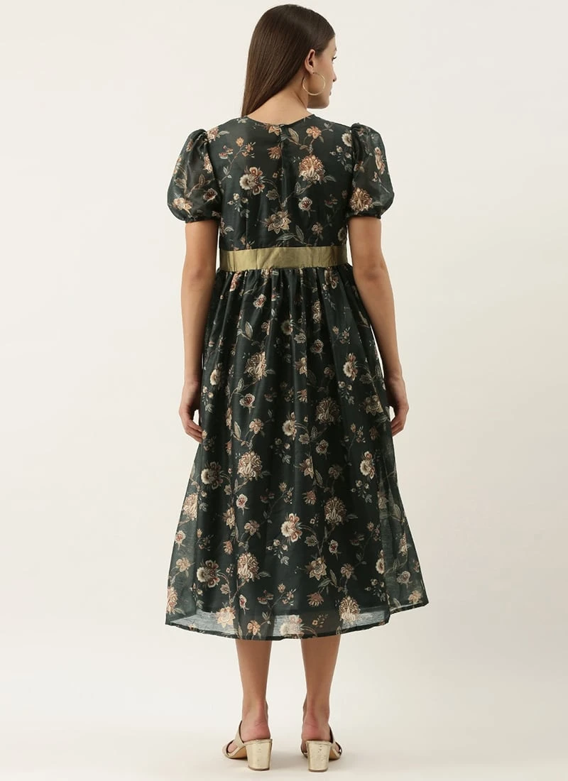 Presenting a green chanderi silk calf-length dress, features sheer close neckline in both front and back, puff half sleeves, yoke until natural waist, hook open in the back and along with side zipper closure, has a gathered flare.It has a nondetachable belt and bow on the waistline..