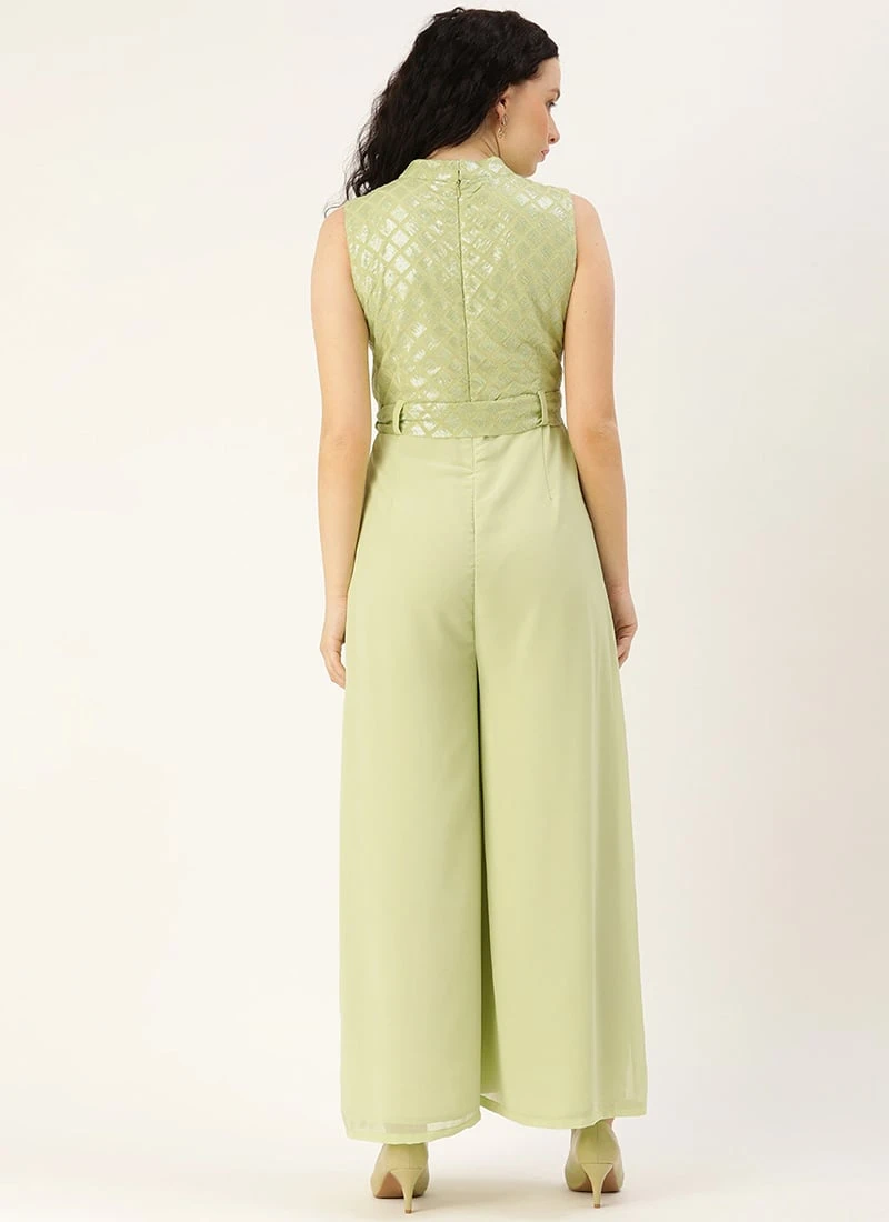 Green Embroidered Collar Neck Jumpsuit Festive Wear