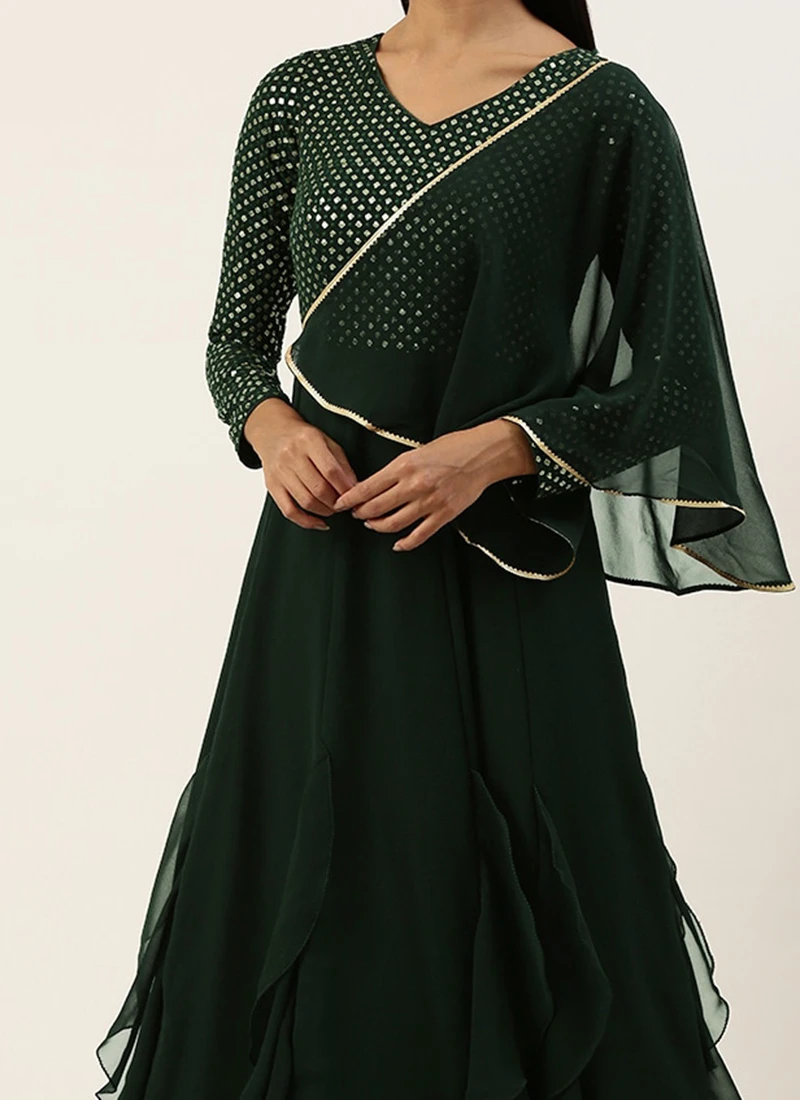 Presenting green kali flared embroidered gown features, embroidered yoke with normal v neckline in front and high neck at the back, full sleeves, side zipper opening, natural waist yoke followed by green georgette kali flare till floor length. All the kali panels has full circular ruffles attachment from thigh to floor length, and a drape is attached front and back from yoke and adorned with trims. .