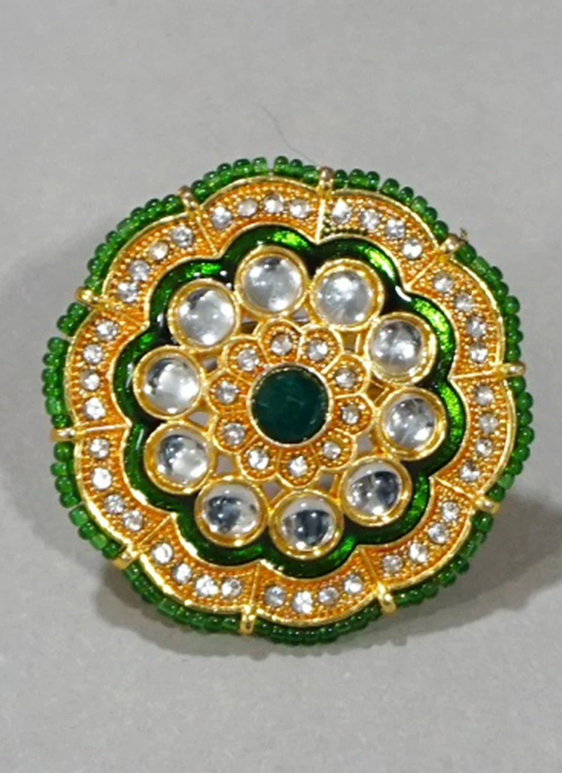Unveil the captivating allure of the Green Kundan Ring a timeless piece of jewelry that embraces the rich heritage of Indian craftsmanship. This exquisite ring combines the enchanting beauty of green Kundan stones with the elegance of traditional design creating a mesmerizing adornment that effortlessly elevates your style. The centerpiece of the Green Kundan Ring features a resplendent green Kundan stone carefully nestled within a delicate brass or goldplated base. The Kundan stones known for their vibrant hues and lustrous appearance lend the ring an aura of natural beauty that evokes images of lush forests and blooming gardens. Crafted by skilled artisans the intricate detailing on the rings band adds to its charm. The ornate patterns and filigree work showcase the expert craftsmanship reflecting the rich artistic heritage that has been passed down through generations. The fusion of the green Kundan stones with the metal base creates a harmonious blend of contemporary elegance and traditional finesse. The Green Kundan Ring isnt just a piece of jewelry its a symbol of elegance and cultural significance. Kundan jewelry has been treasured in India for centuries adorning the royals and nobility during special occasions and celebrations. By wearing this ring you become a part of this cherished legacy connecting with the timeless traditions of Indian artistry. The rings versatility allows it to complement a range of outfits and occasions. Whether youre dressing up for a festive event adding a touch of elegance to your work attire or accessorizing your casual wear this ring is sure to make a statement and garner compliments wherever you go. Beyond its aesthetic charm the Green Kundan Ring holds sentimental value making it a thoughtful gift for loved ones. Its rich green hue is also associated with prosperity and new beginnings making it a cherished talisman for those seeking positive energy and blessings. In conclusion the Green Kundan Ring is a celebration of natural beauty and timeless elegance. Its captivating design adorned with green Kundan stones and intricate metalwork reflects the harmony between tradition and modernity. Embrace the enchanting charms of this exquisite ring and let it become a cherished piece of jewelry that captures the essence of your unique style and personality.