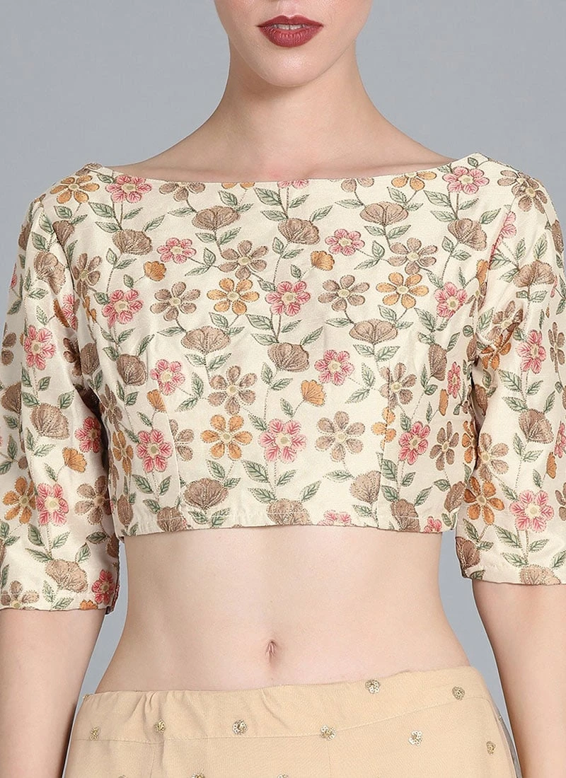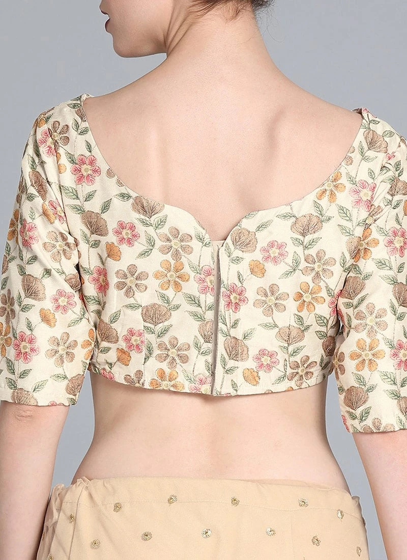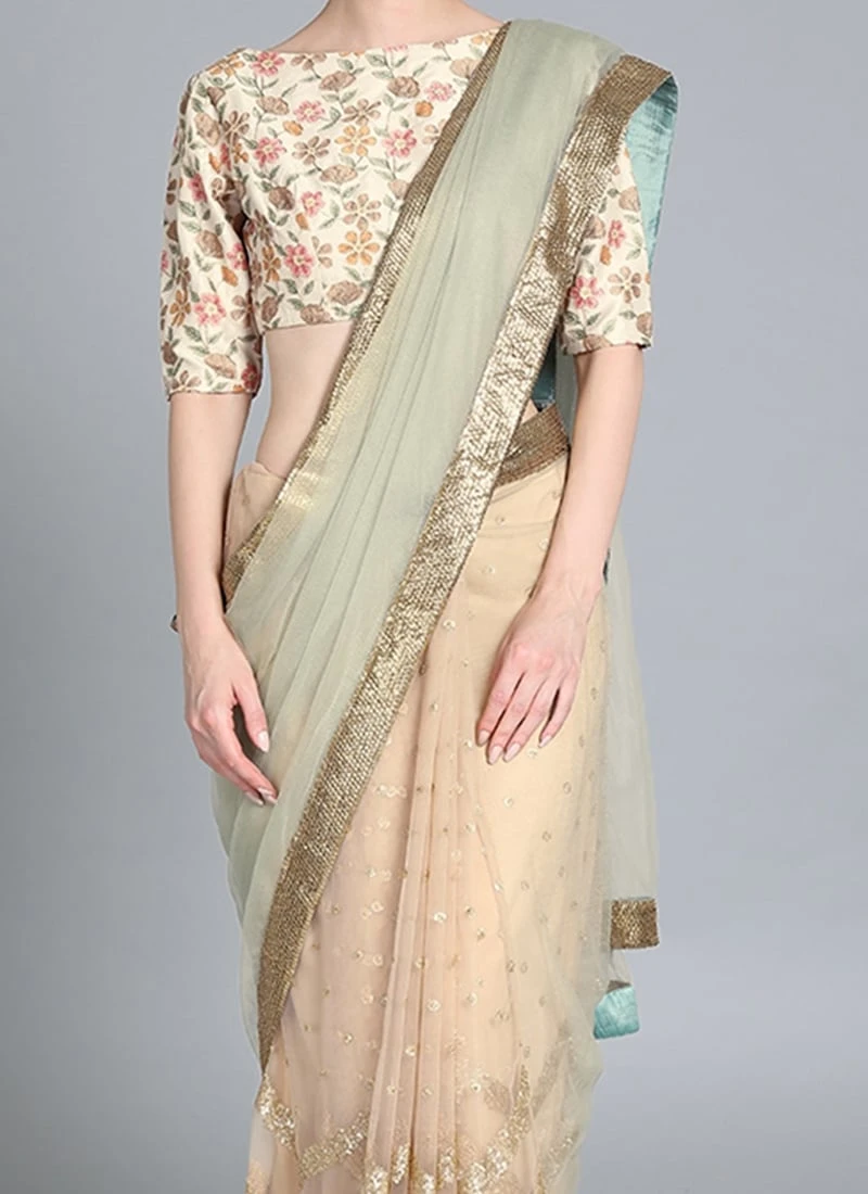 Presenting an embroidered half and half saree, features a cream embroidered boat neckline blouse, sweetheart neckline in the back, elbow sleeves, comes with back hook open. It is paired up with a beige embroidered saree with green net pallu with sequins border..