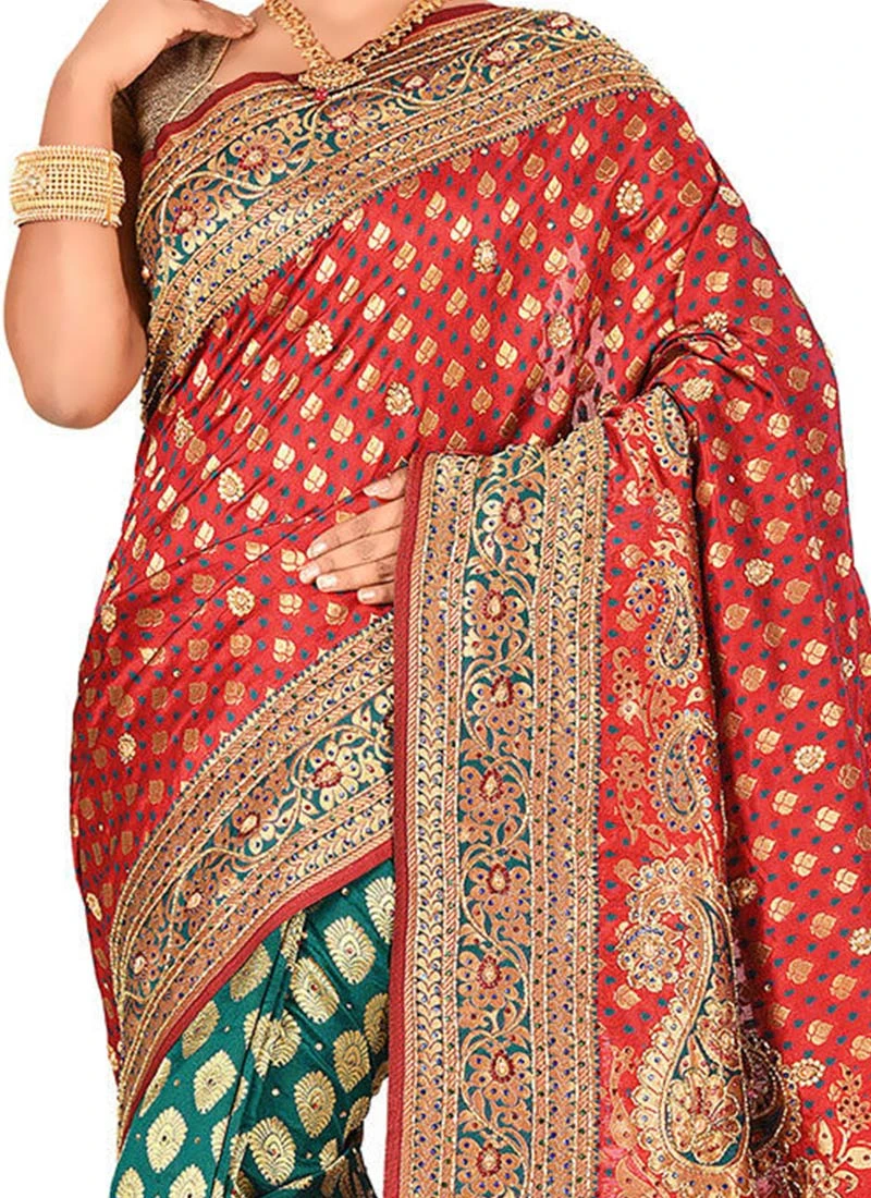 Green N Red Art Silk Kancheepuram Half N Half Sare Festive Wear