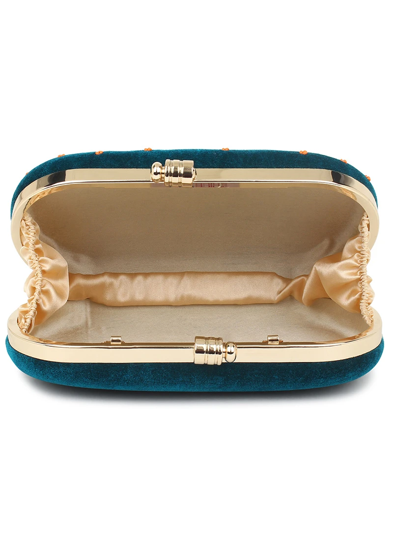 The designer green velvet clutch, the inner is satin fabric and some decorative designs on the clutch.