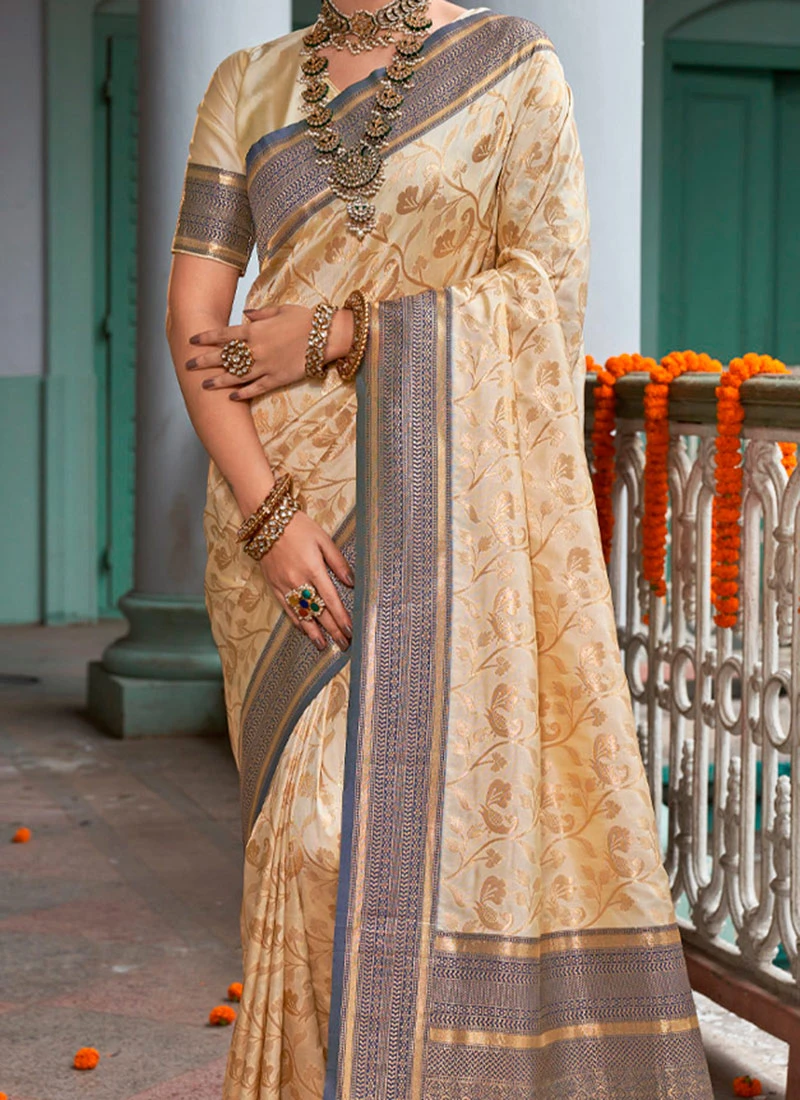 The pallu which is the loose end of the saree is often the highlight of a Benarasi saree. In this grey art silk Benarasi saree the pallu is a visual delight featuring elaborate zari work that shimmers gracefully as it catches the light. The border is equally captivating enhancing the overall allure of the saree. The contrast between the grey base and the golden zari embroidery adds depth and dimension to the design creating a captivating visual impact.