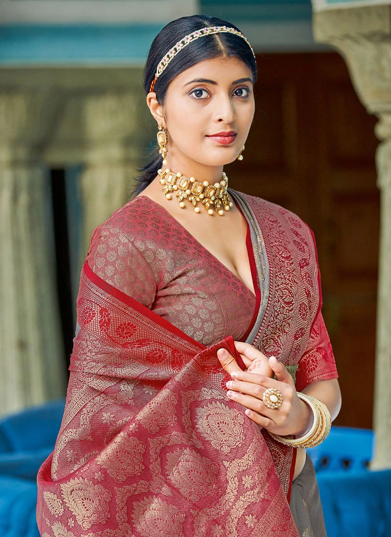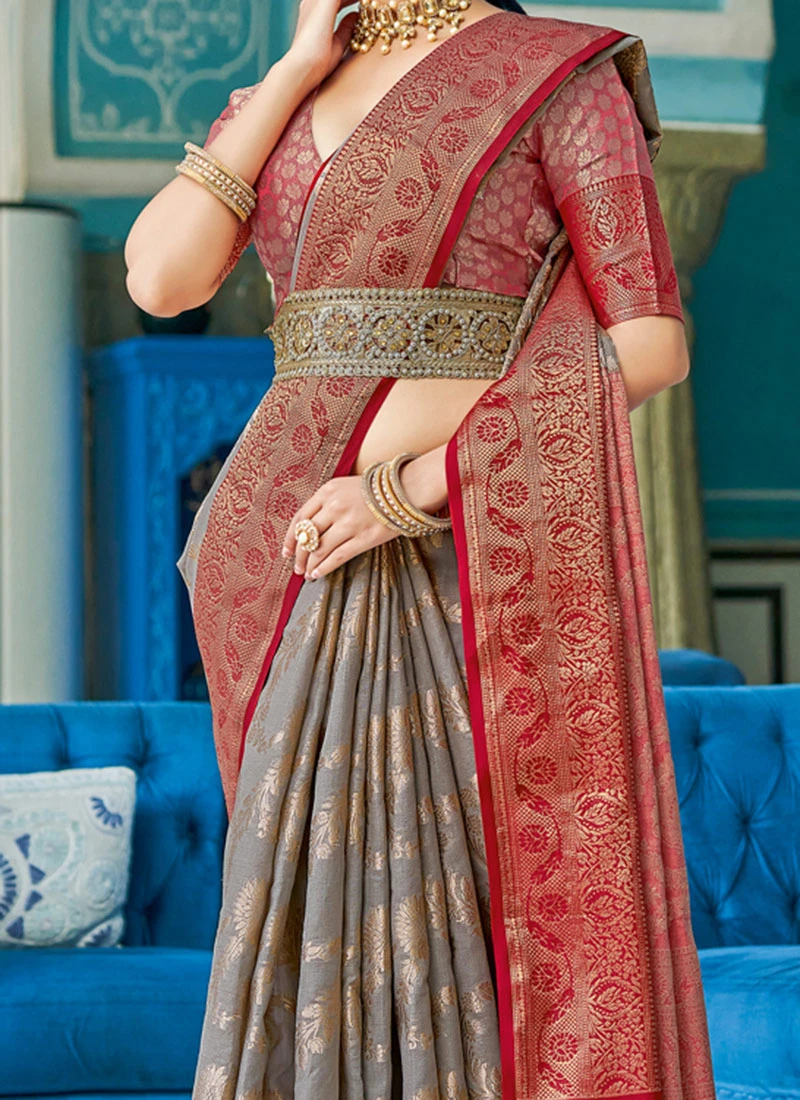 Grey Cotton Zari Work Saree Festive Wear