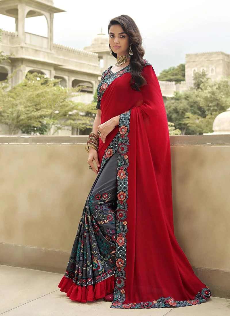 Grey N Red Silk Zari Embroidery Work Half N Half Saree Party Wear
