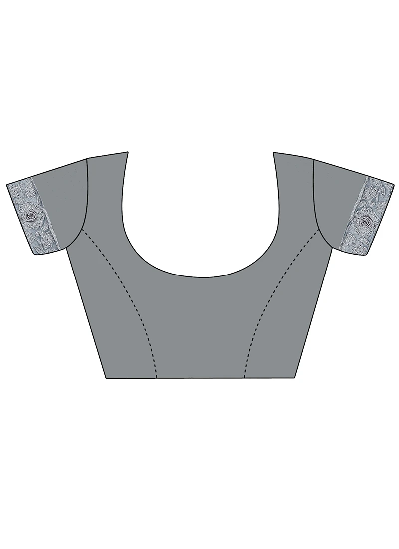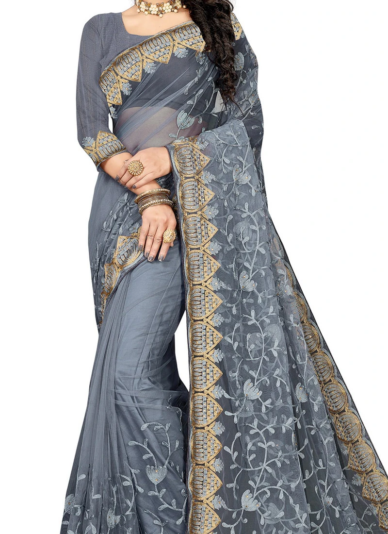 Grey Net Embroidered Work Saree Festive Wear