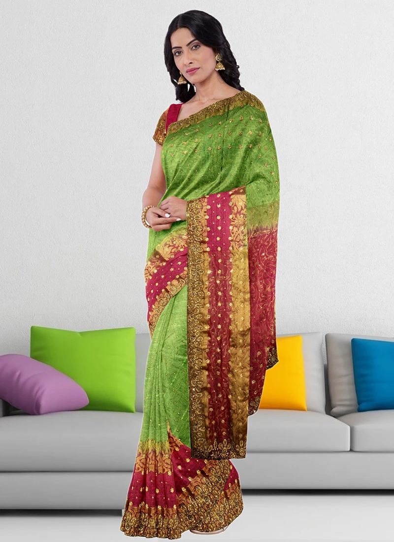 Jacquard Pista Green Color Hand Embroidered Stone Work Saree Party Wear