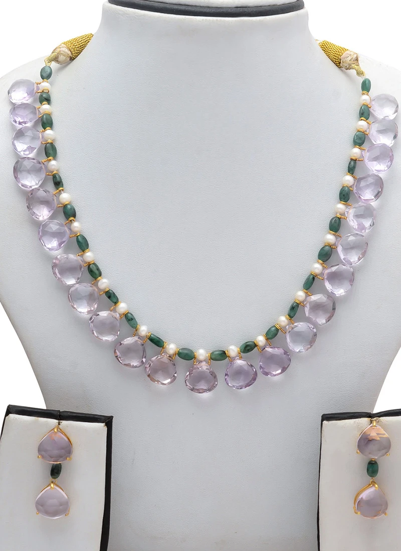 Introducing our Lavender Real Amethyst Real Emerald and Cultured Pearl Necklace Seta masterpiece that effortlessly combines the elegance of genuine gemstones with the timeless beauty of cultured pearls. Crafted with meticulous attention to detail this exquisite necklace set is a celebration of natures finest creations.