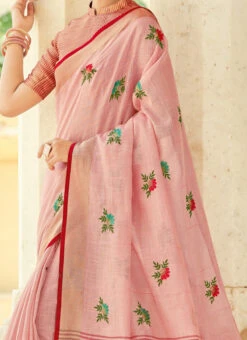 Light Pink Linen Zari Work Saree Festive Wear