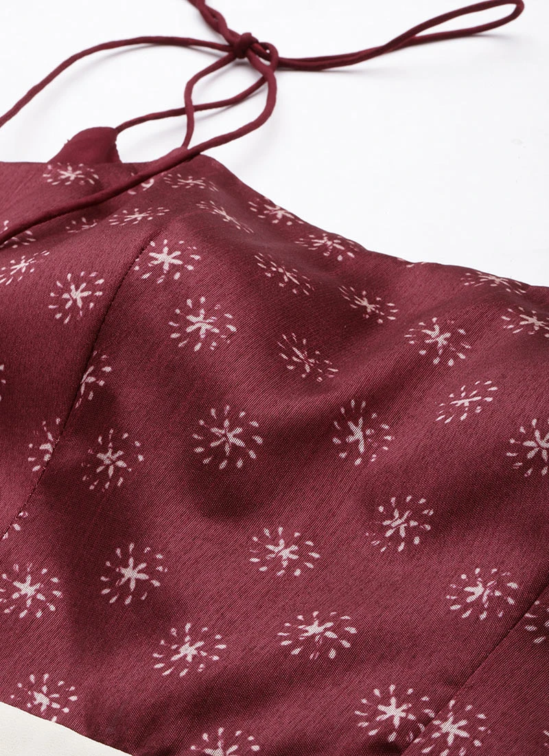 Maroon Art Silk Printed N Off White Layered Dress Festive Wear