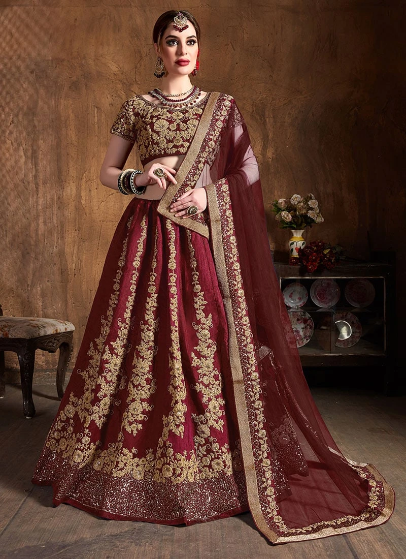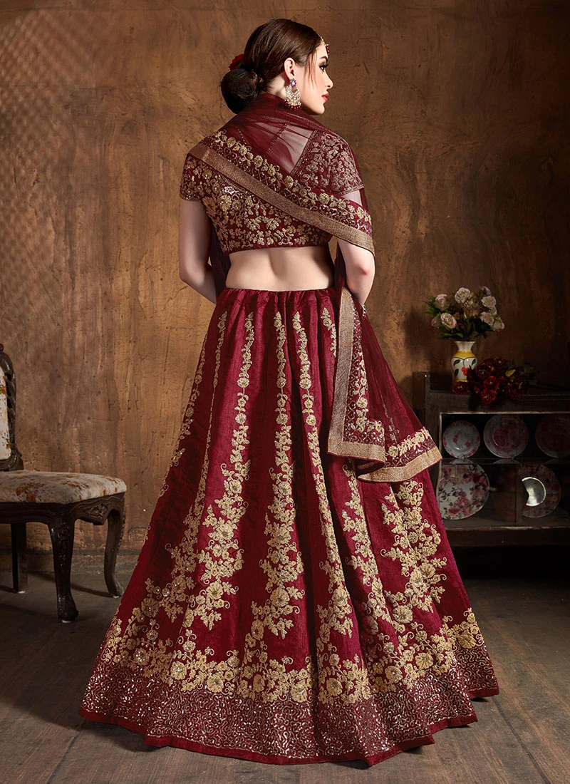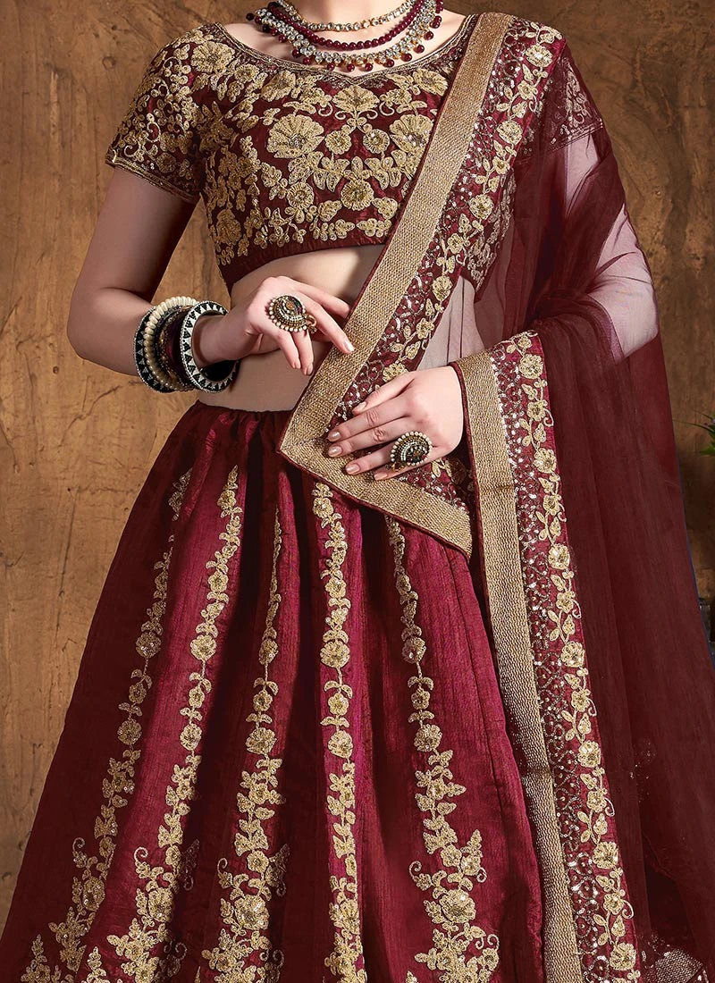 Maroon Benarasi Silk Embroidered Umbrella Lehenga Party Wear