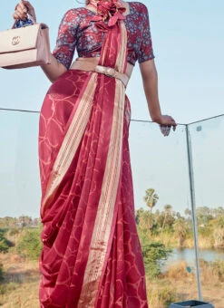The maroon colour of this sari is both regal and versatile. Maroon is a classic choice for Indian attire symbolizing auspiciousness and tradition. The sari features a mesmerizing print that is a true work of art. The intricate patterns and designs on the sari are a testament to the skill and craftsmanship of the artisans who created it. The print is thoughtfully placed to enhance the overall look and create a harmonious design that draws attention.