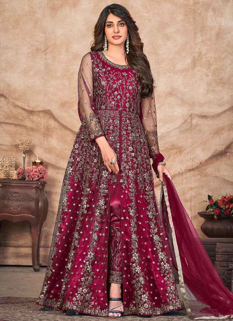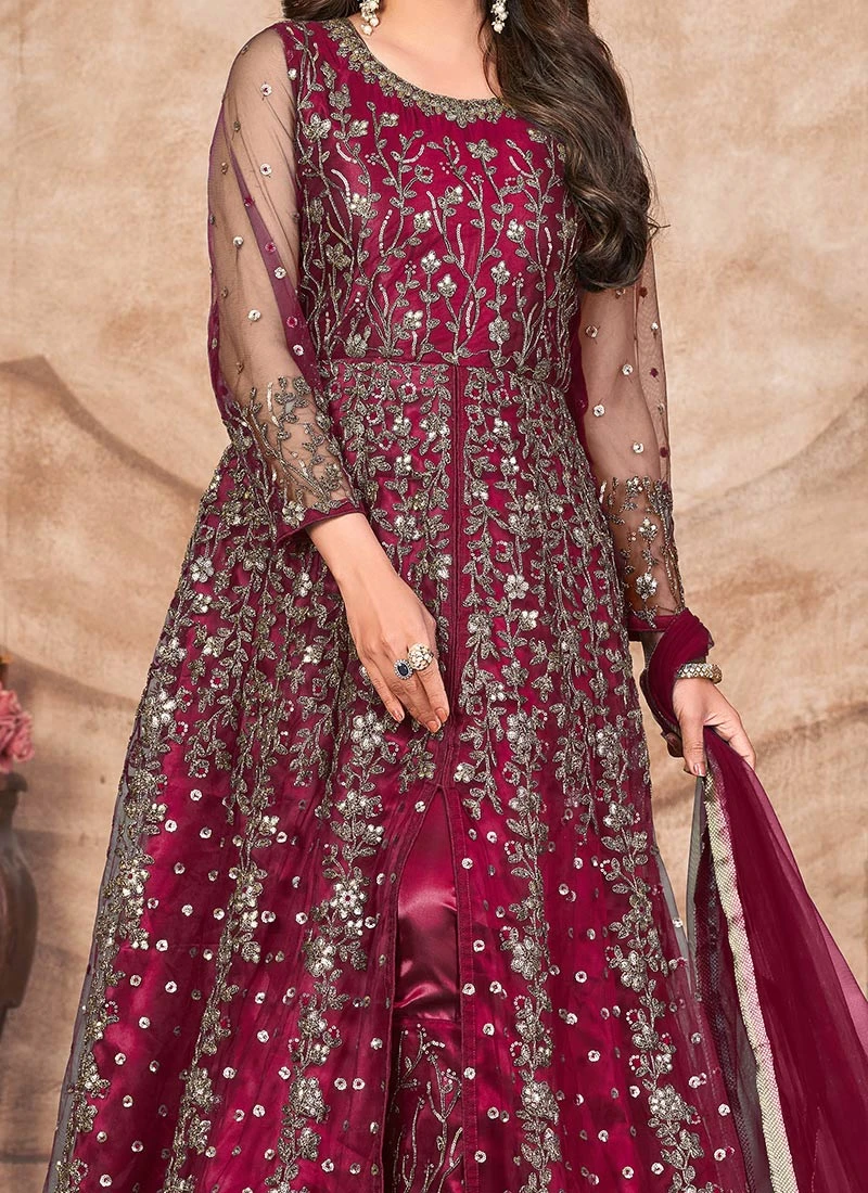 Elegance tradition and opulence come together in our Maroon Net Embroidered Anarkali Suit a masterpiece of Indian ethnic fashion that captures the essence of timeless grace and sophistication. This regal ensemble is meticulously crafted to make you feel like royalty whether youre attending a grand wedding a festive celebration or a cultural event. The Maroon Net Embroidered Anarkali Suit is a testament to the rich heritage and craftsmanship of Indian attire.