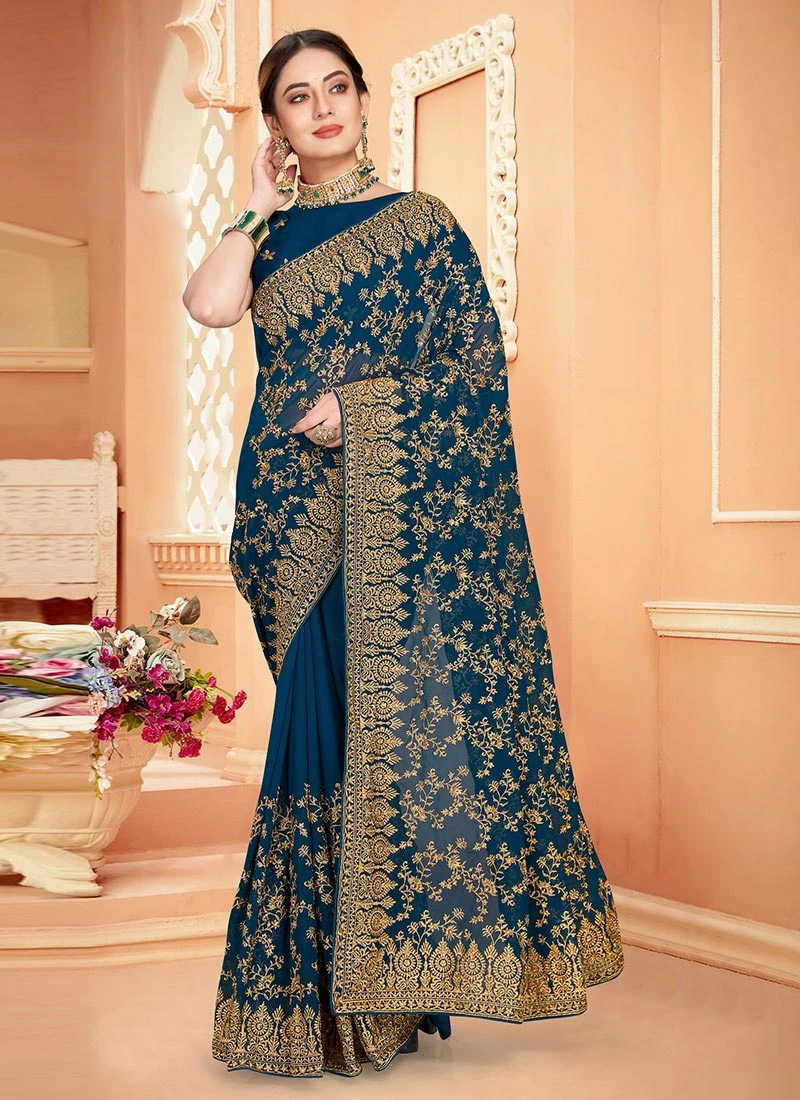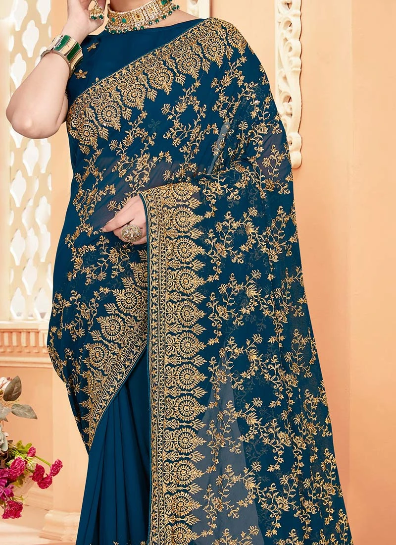 Morpeach Blue Georgette Zari Embroidery Work Saree Party Wear